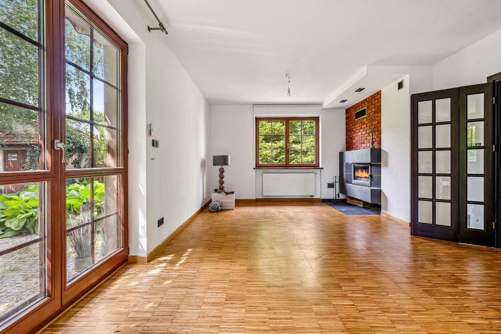 - salon z kominkiem, połączony z jadalnią i z wyjściem na duży taras