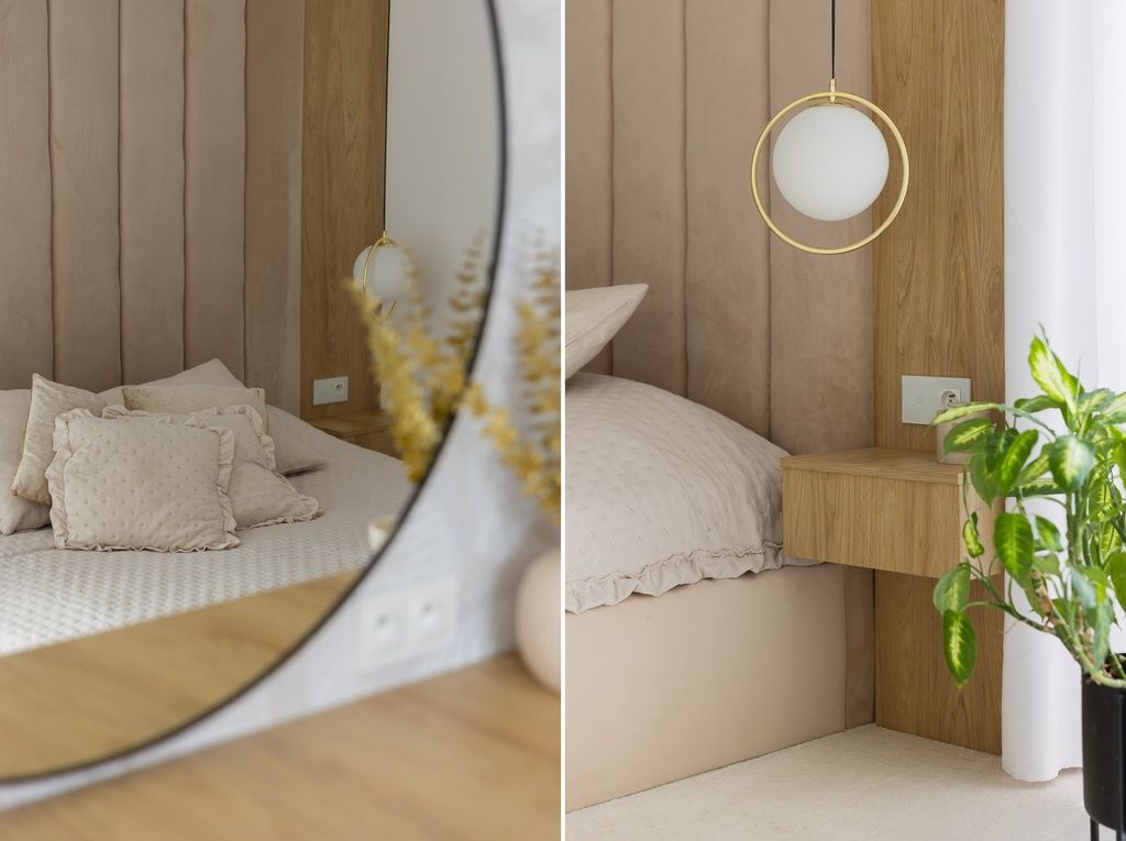 Sypialnia główna została wyposażona w tapicerowane łóżko robione na zamówienie, które sięga sufitu, oraz dużą szafę wykonaną na wymiar. Miękka wykładzina podłogowa nadaje wnętrzu przytulności i podnosi komfort codziennego użytkowania.