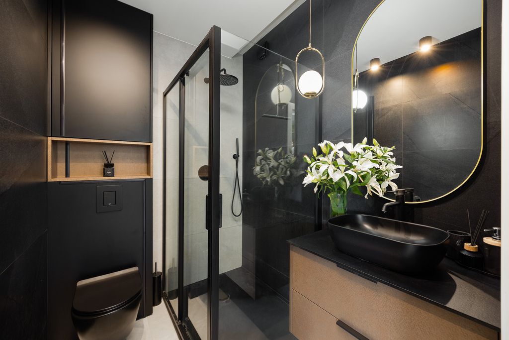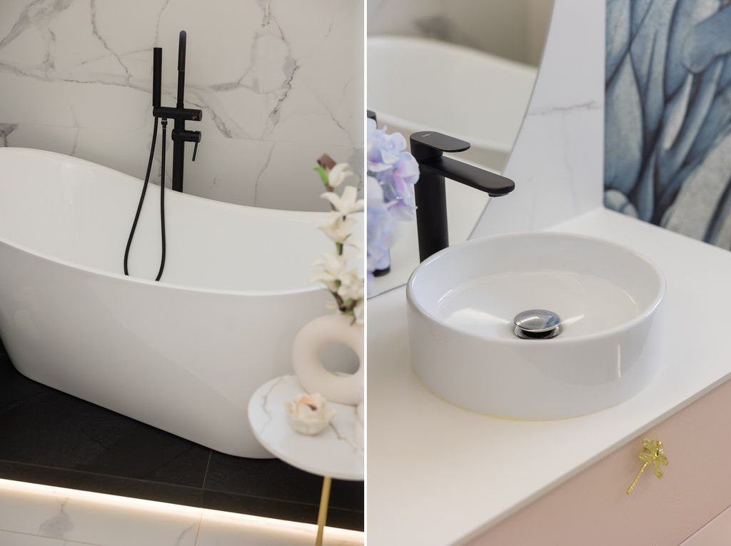 Łazienki to dwa osobne pomieszczenia – jedna z wanną, druga z prysznicem – obie z WC. Wyposażone w nowoczesną armaturę, wysokiej jakości ceramikę i meble wykonane na wymiar, oferują funkcjonalność oraz estetyczny wygląd.