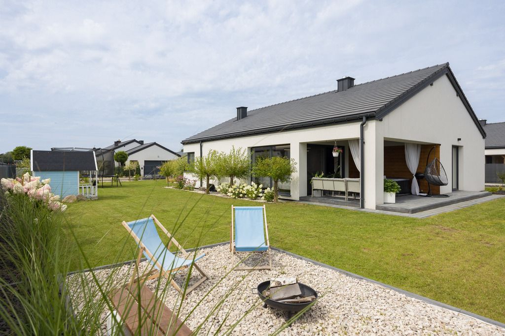 Rośliny dobrano tak, aby ich pielęgnacja była niskonakładowa, co czyni ogród idealnym rozwiązaniem dla osób ceniących estetykę bez konieczności poświęcania dużej ilości czasu na prace ogrodowe. W części rekreacyjnej znajduje się miejsce na palenisko, doskonałe na wieczorne spotkania przy ogniu, a także plac zabaw dla dzieci o powierzchni około 30 m², wyposażony w trampolinę, drewniany domek i piaskownicę – wszystko to zapewnia świetną zabawę najmłodszym domownikom.