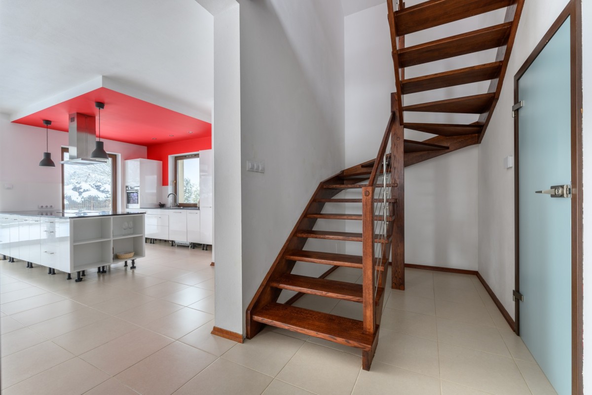podłogi: gres oraz parkiet z egzotycznego drewna Merbau (lakierowany),