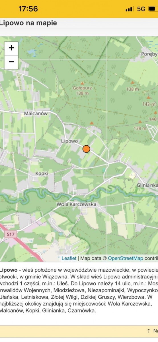 Oferuję do sprzedaży działkę w miejscowości Lipowo, gmina Wiązowna powiat Otwock. Miejscowość ta położona jest we wschodniej części gminy Wiązowna, blisko węzła Lubelska z doskonałym połączeniem z Warszawą. W okolicy sklepy spożywcze, ośrodek zdrowia, szkoła.
