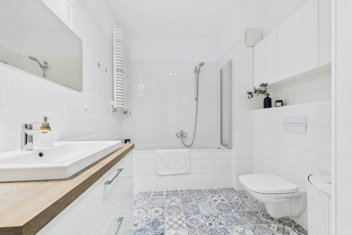 W przestronnej łazience znajduje się duża, komfortowa wanna, toaleta, umywalka oraz pralka w zabudowie.