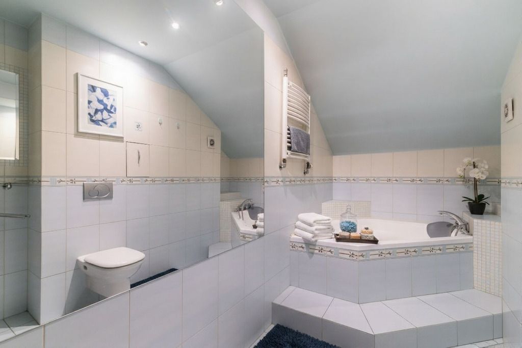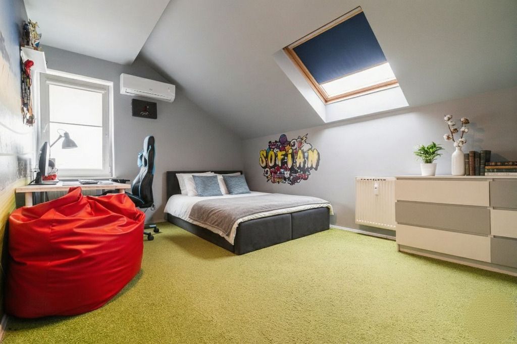 Dwie niezależne sypialnie ze skosami, wydajna klimatyzacja oraz pojemna garderoba eliminująca potrzebę ustawiania ciężkich szaf. Skosy tworzą naturalną izolację termiczną zimą, klimatyzacja zapewnia komfort w upalne lato.