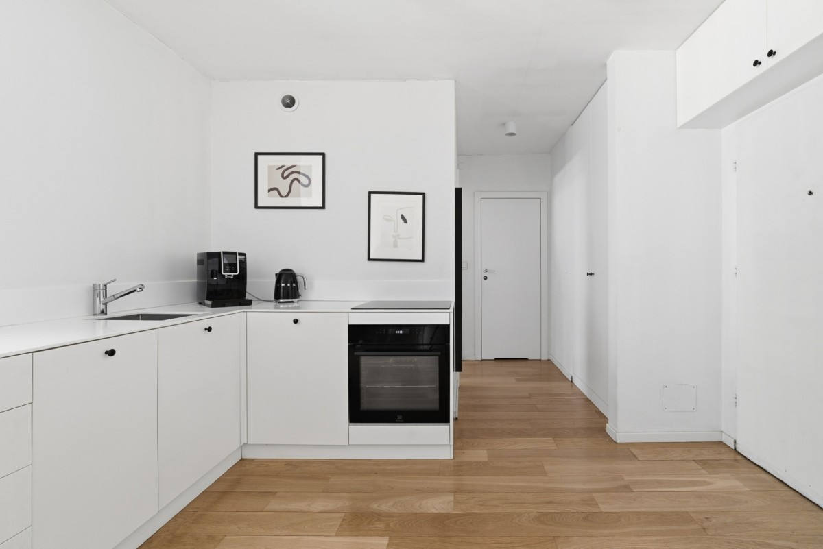 - salonu z aneksem kuchennym, zabudowanym meblami na wymiar z eleganckim blatem ze spieku oraz wyposażonym w sprzęt Electrolux i Bosch;