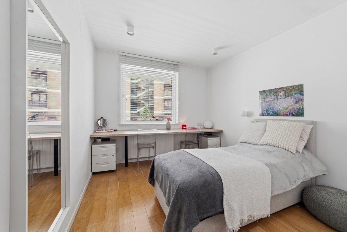 Dużym atutem są liczne szafy wykonane na zamówienie i sięgające sufitu — oferują wyjątkowo dużo miejsca do przechowywania.