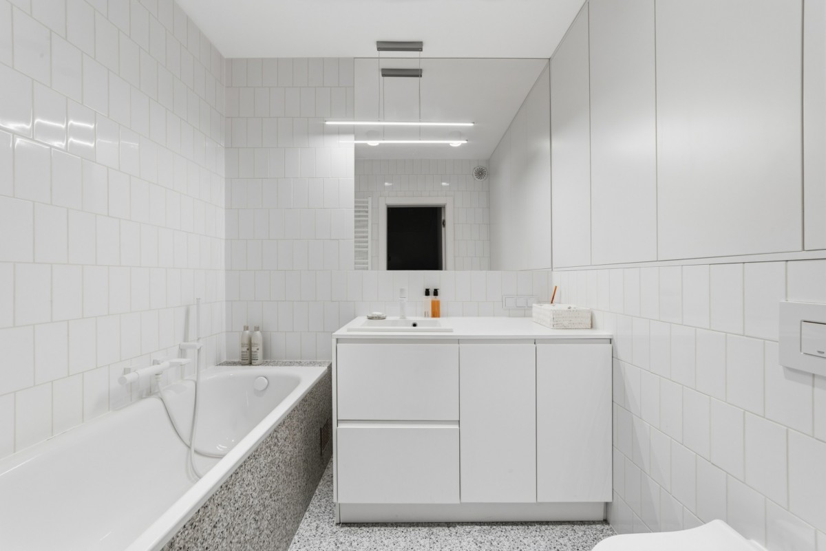 - łazienki po generalnym remoncie, wykończonej w stylu nowoczesnej elegancji — z terakotą Ornamenta, płytkami typu „metro”, wanną Kaldewei, armaturą Tres oraz pralko-suszarką Electrolux.