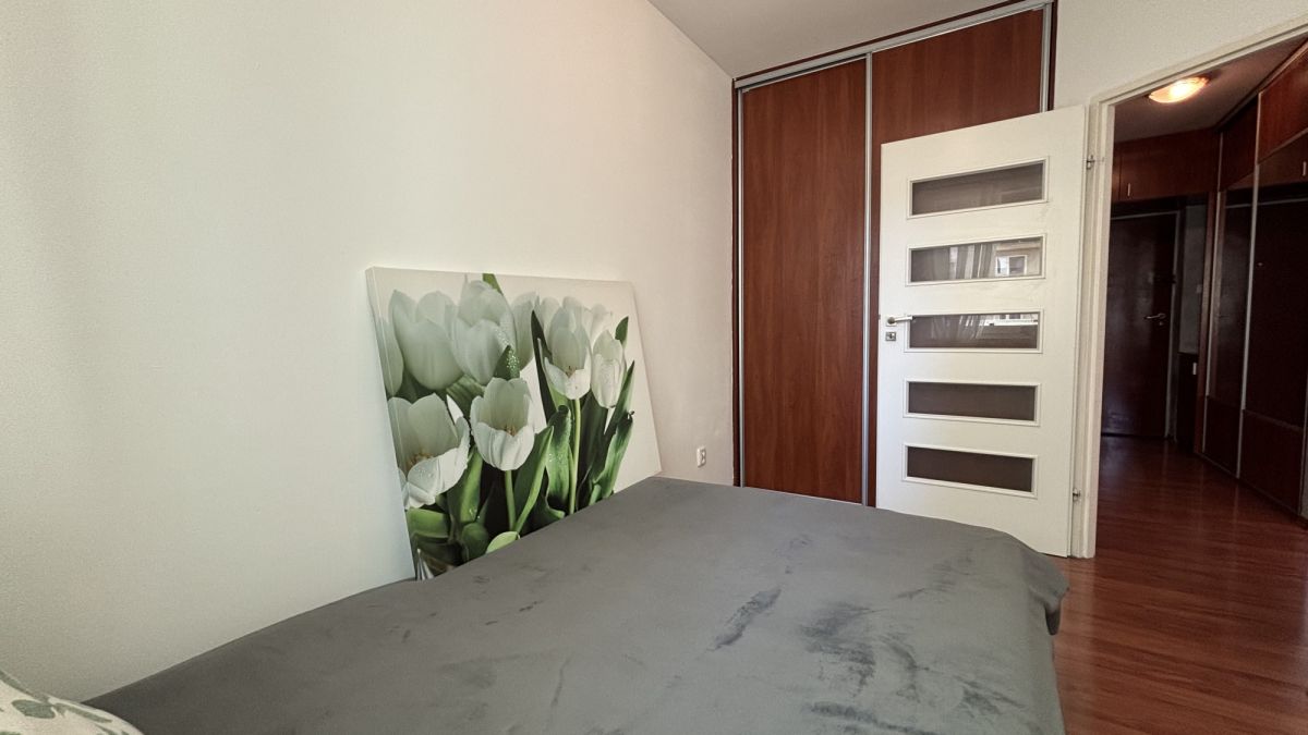 Sypialnia (8,8 m²) jest ustawna i funkcjonalna - bez problemu mieści łóżko o wymiarach 140×200 oraz dużą szafę w zabudowie sięgającą sufitu. To przytulna, spokojna przestrzeń sprzyjająca odpoczynkowi.