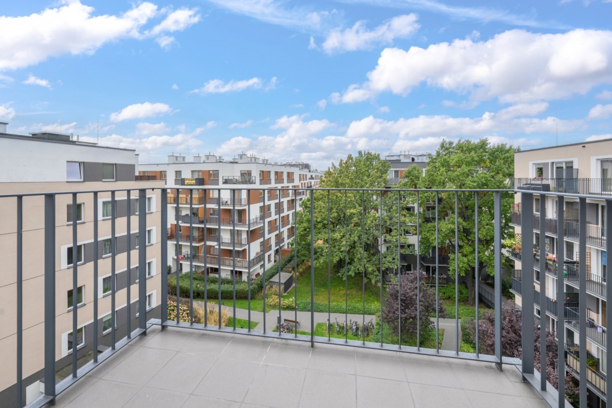 - Balkony dostępny z salonu — przyjemny widok na zielone patio osiedla