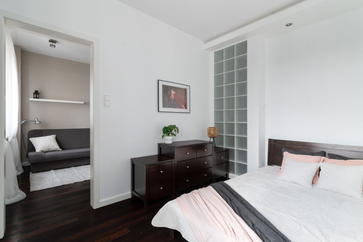 * Dwa niezależne pokoje - obecnie sypialnia i gabinet, z możliwością aranżacji na dwie sypialnie lub sypialnię z pokojem dziecięcym,