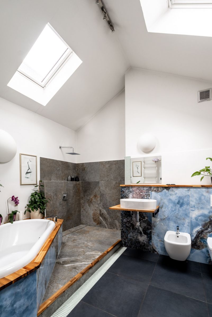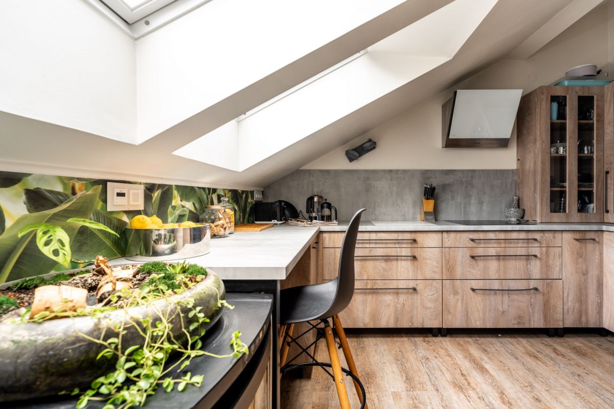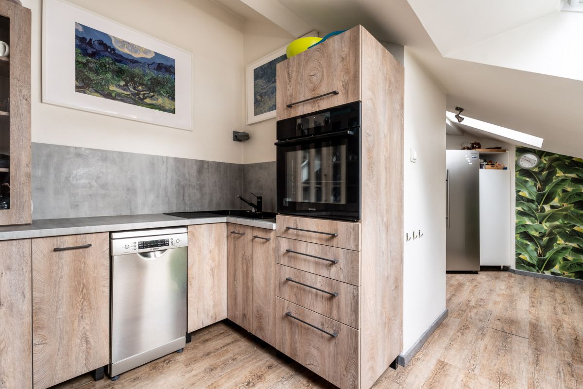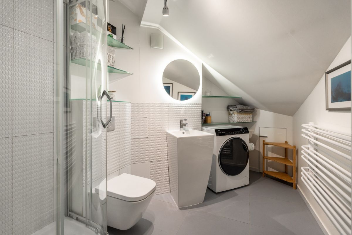 Mieszkanie jest częściowo z oknami połaciowymi i skosami, co nadaje mu wyjątkowy, przytulny klimat, a częściowo z pionowymi oknami, które wprowadzają dużo naturalnego światła. Dzięki temu wnętrza są jasne i pełne charakteru.