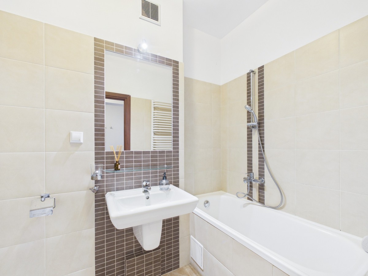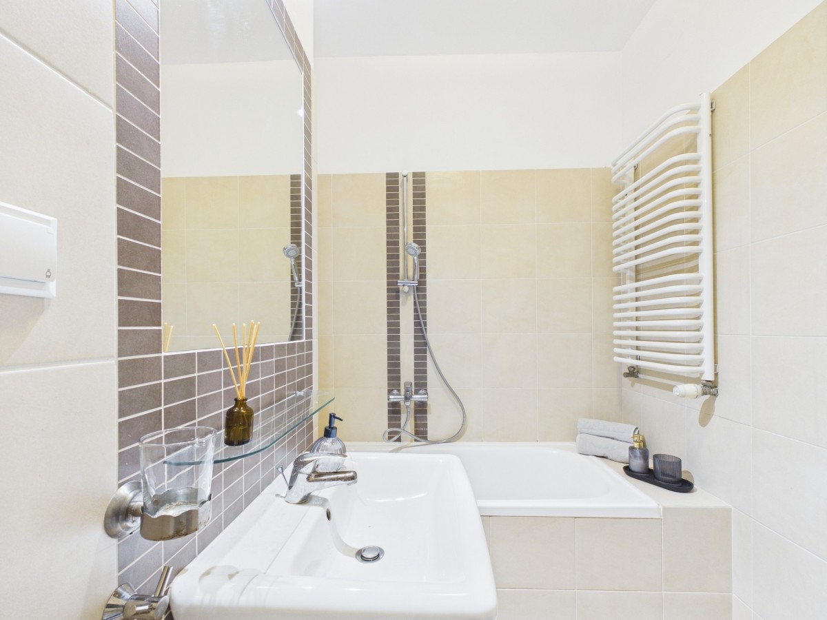 łazienka: wyposażona w wannę, umywalkę, WC i pralkę