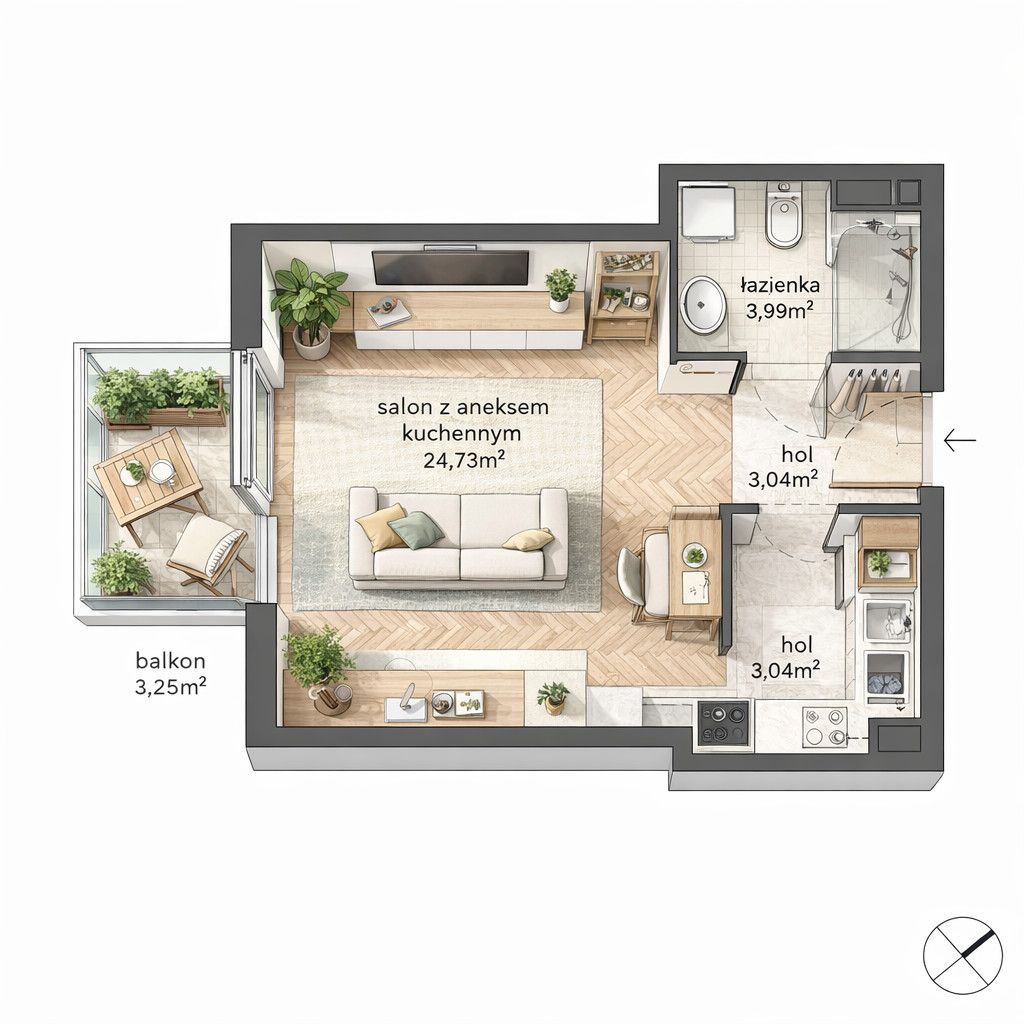 Mieszkanie o powierzchni 31,76m2 składa się z dużego pokoju z aneksem kuchennym, łazienki, przedpokoju oraz balkonu.