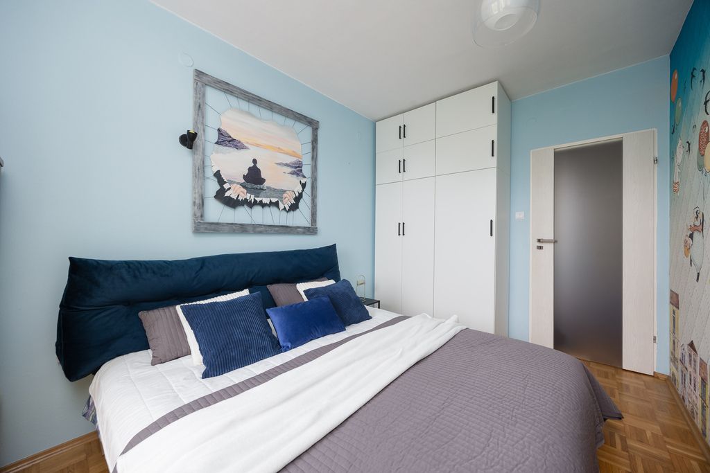 - drugiej sypialni (9,9 m²) z wyjściem na balkon (ok. 3 m²),