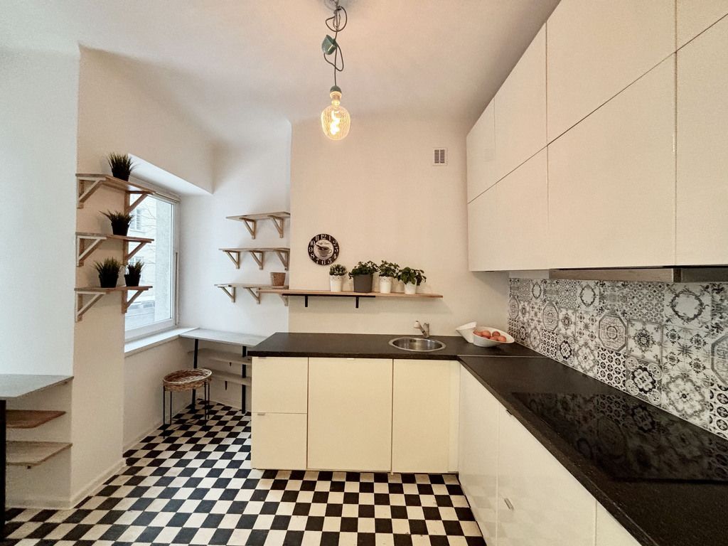 •Niezwykły klimat wnętrz — duże okna, drewniana podłoga, wysokie sufity oraz elementy zabudowy charakterystyczne dla kamienic.