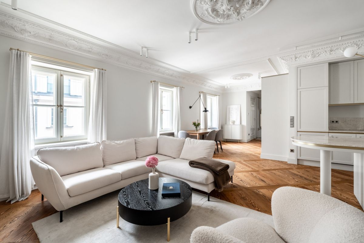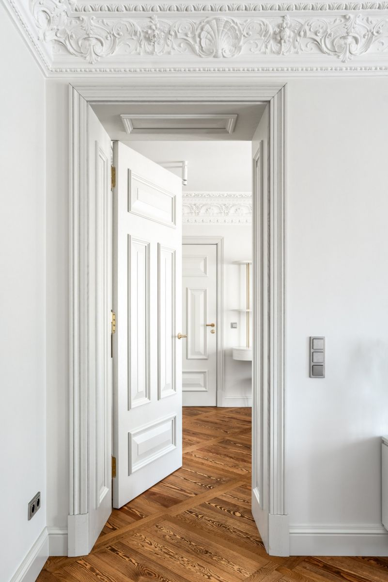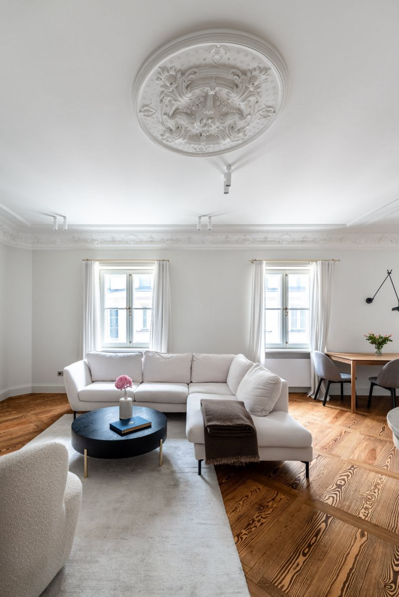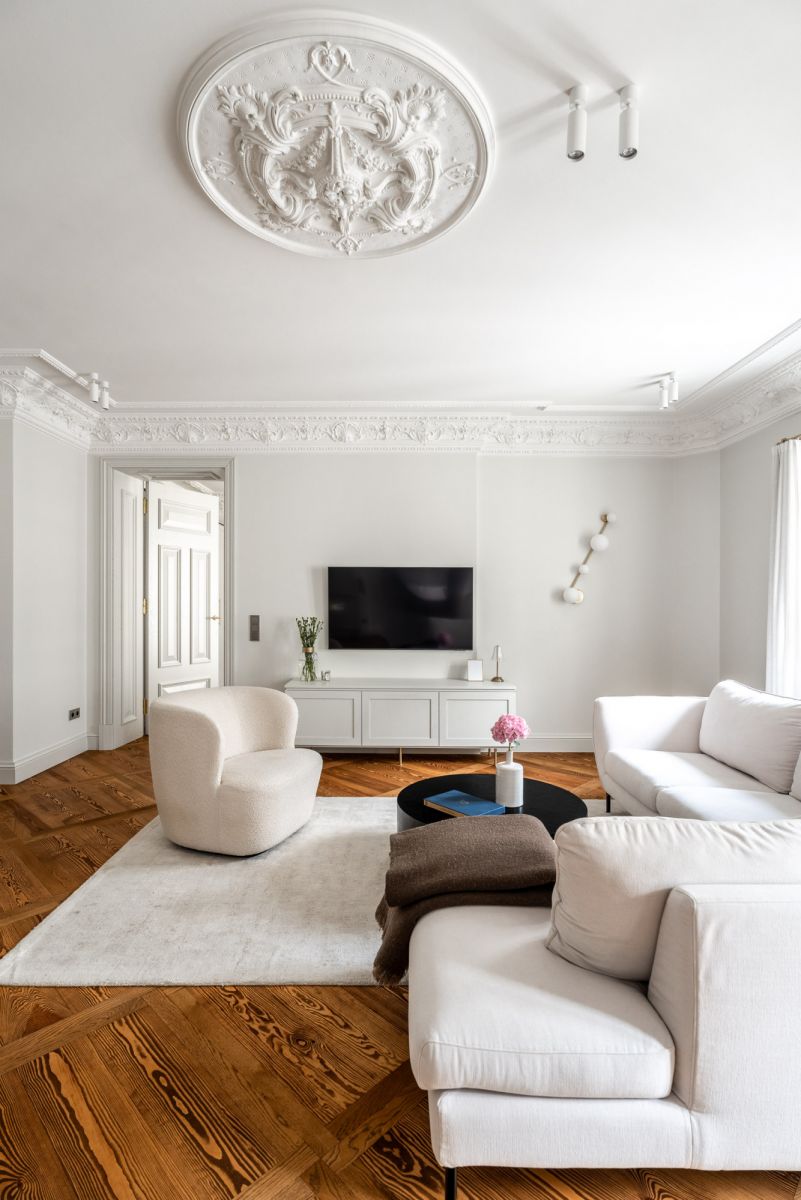 * Sufit i sztukateria: historyczne, pieczołowicie odrestaurowane. Warto zaznaczyć, że nie w każdym mieszkaniu udało się zachować oryginalne detale - tam, gdzie ich nie było, właściciele mogli wybrać dowolny styl wykończenia. Tu zachowano oryginał.
