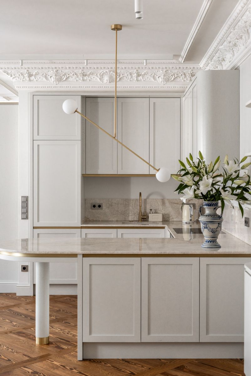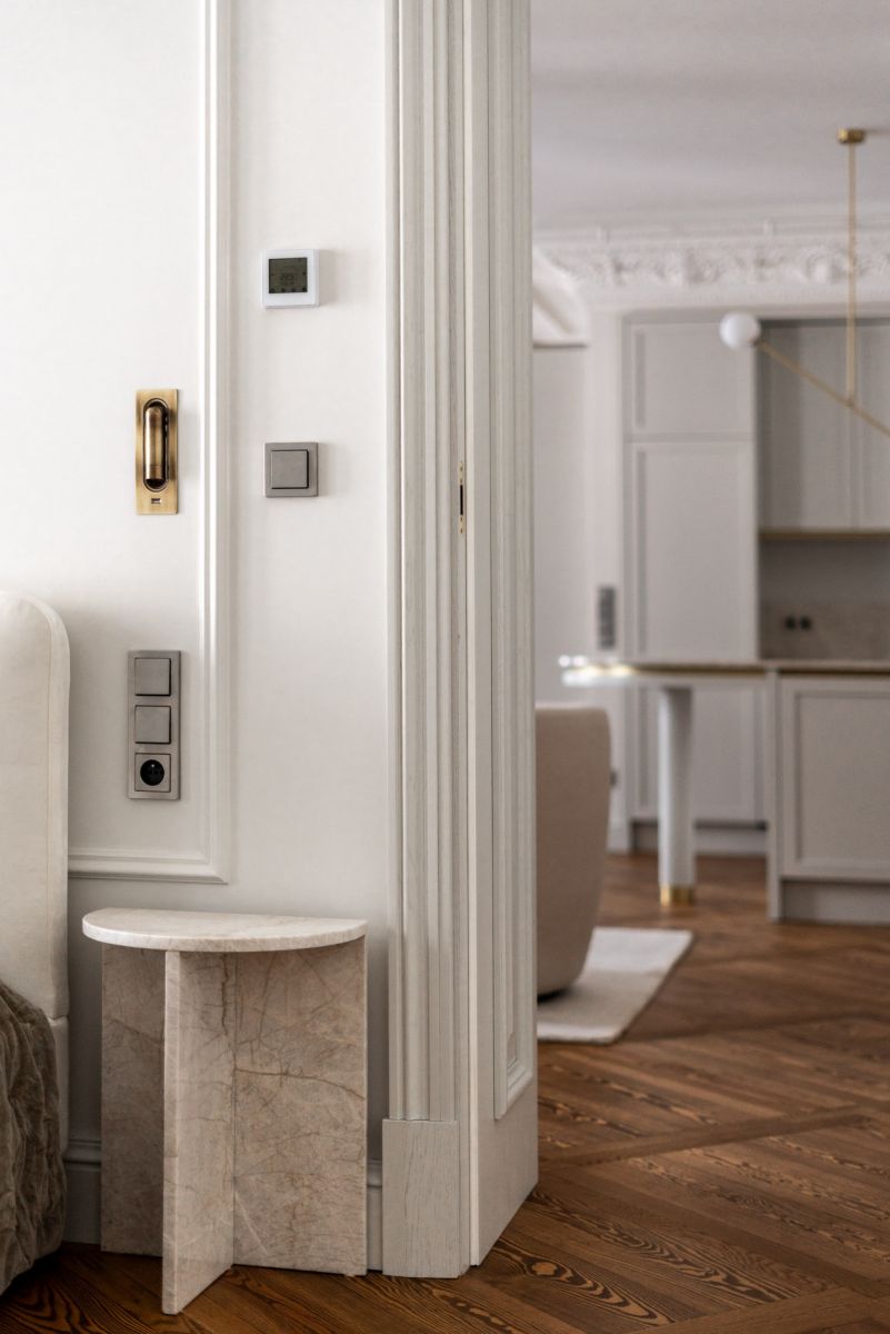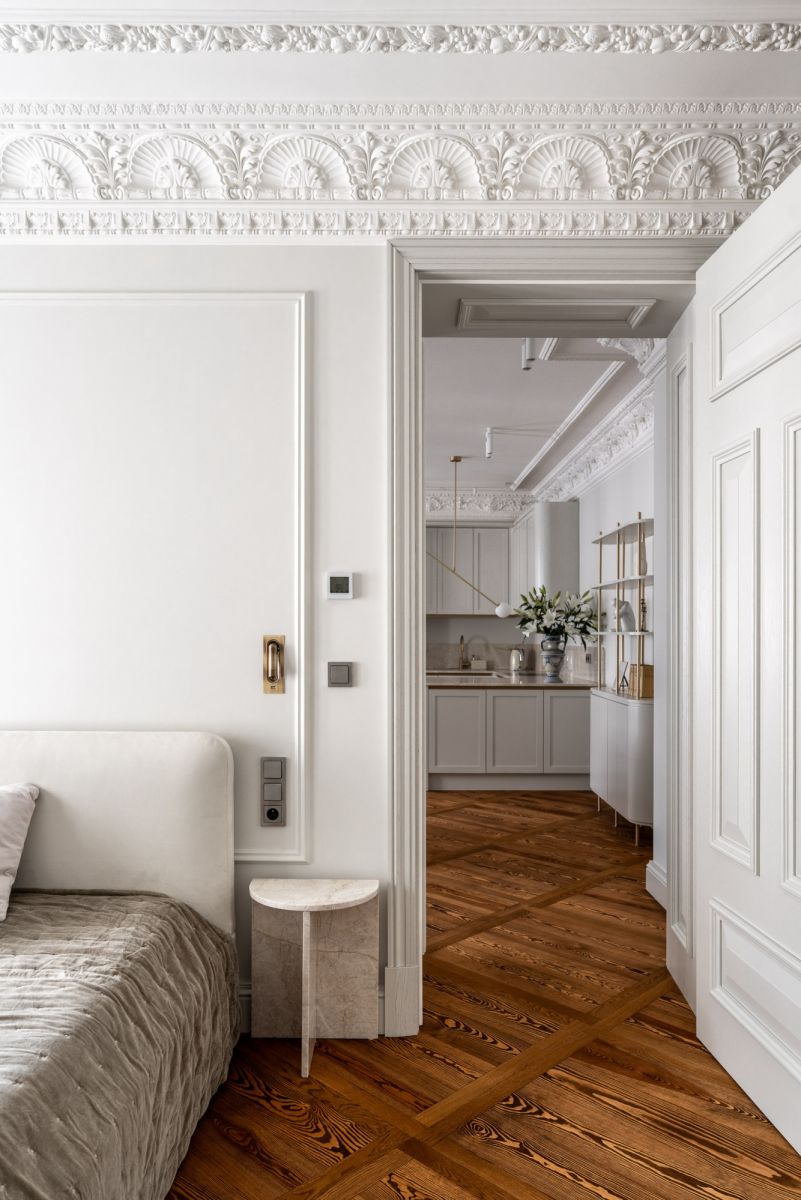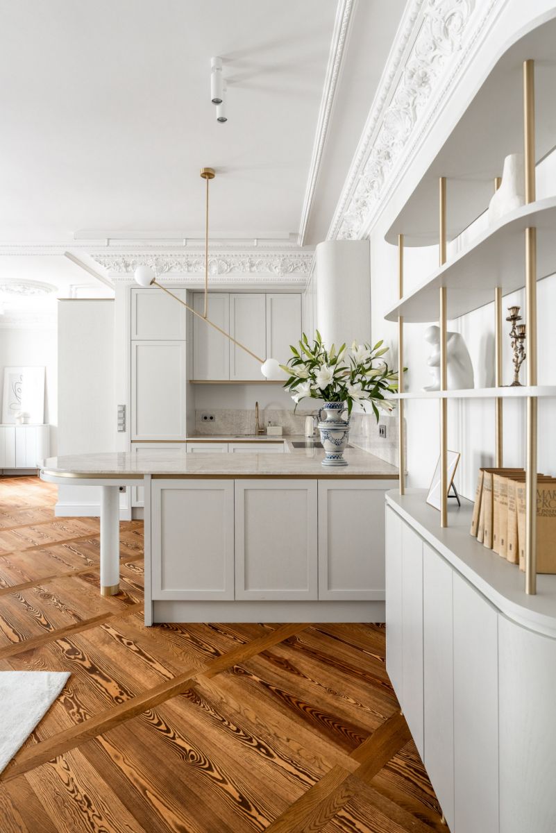 * Sufit i sztukateria: historyczne, pieczołowicie odrestaurowane. Warto zaznaczyć, że nie w każdym mieszkaniu udało się zachować oryginalne detale - tam, gdzie ich nie było, właściciele mogli wybrać dowolny styl wykończenia. Tu zachowano oryginał.