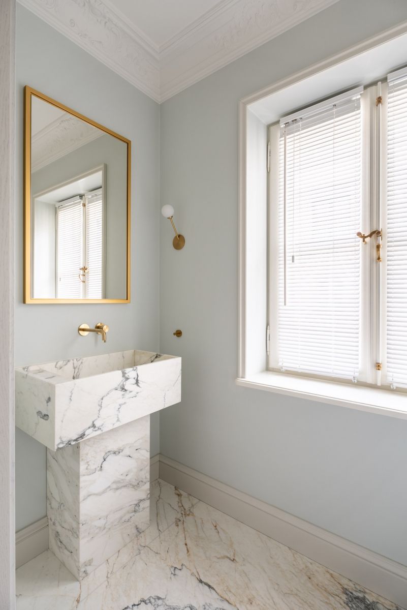 W łazience przy sypialni: marmur Statuario Corchia oraz blat z marmuru Emperador Light
