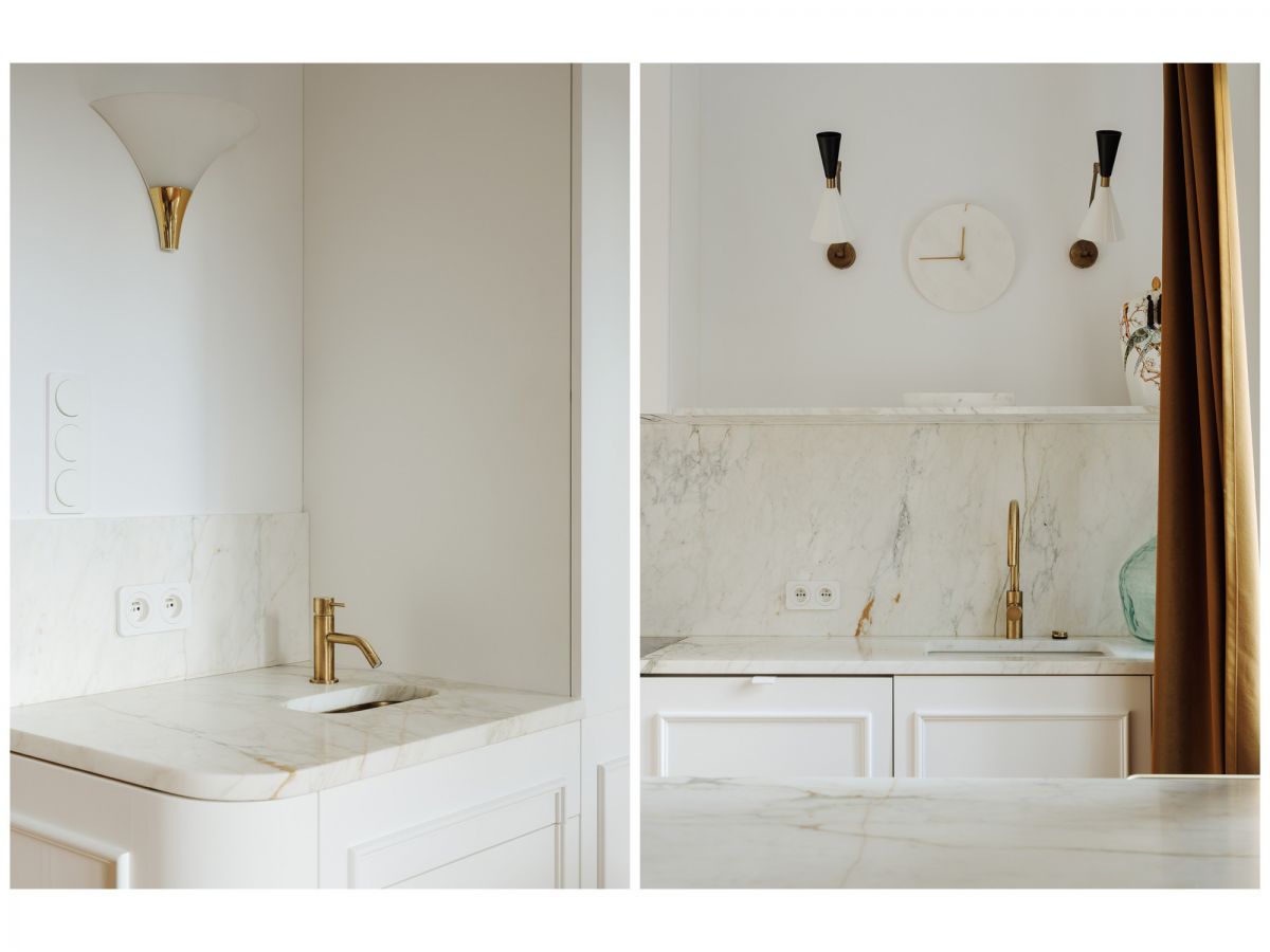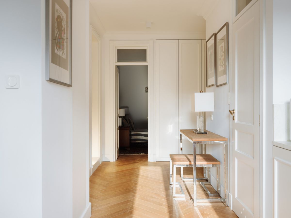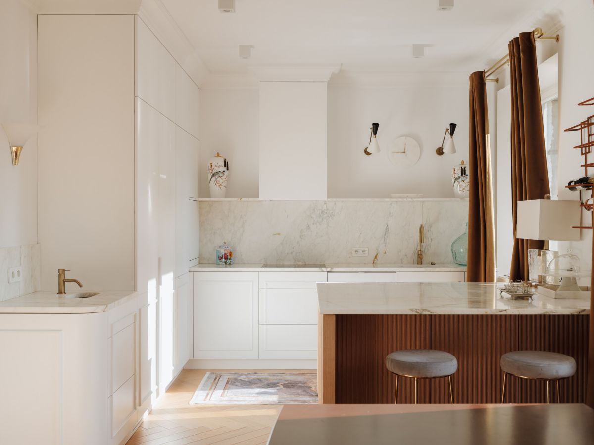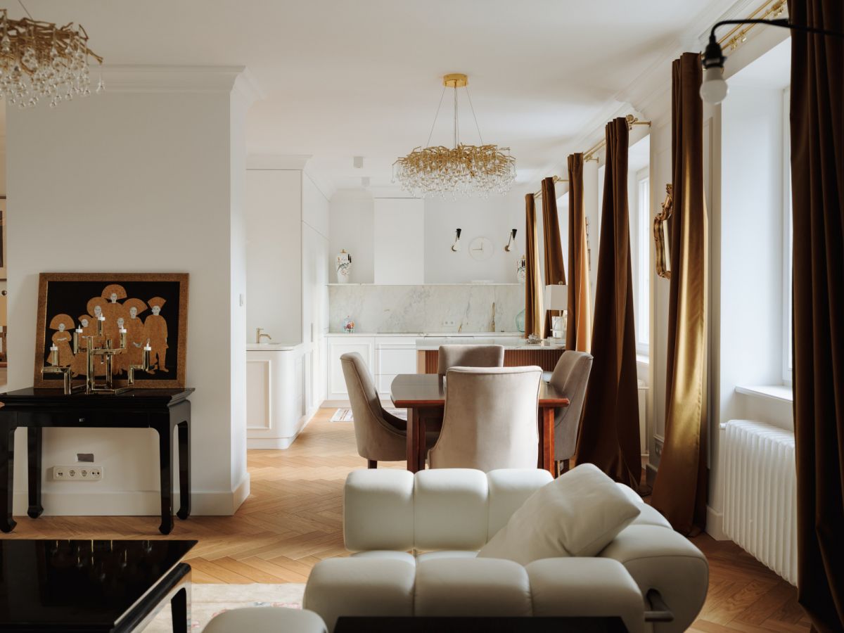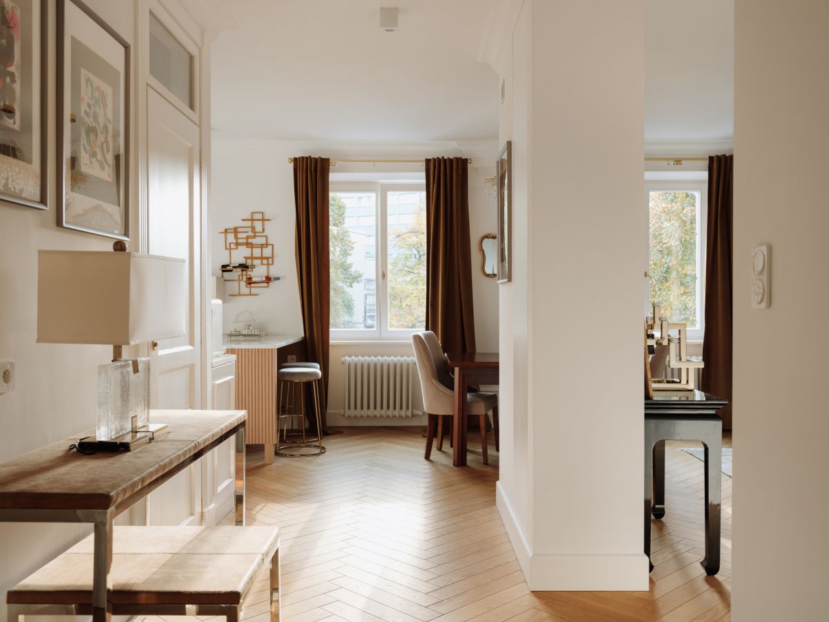 The apartment underwent a complete renovation four years ago and was finished to a high standard, featuring natural stone, wooden parquet in a French herringbone pattern, and stylish details. The high ceilings and large windows in the living room enhance the sense of spaciousness.
