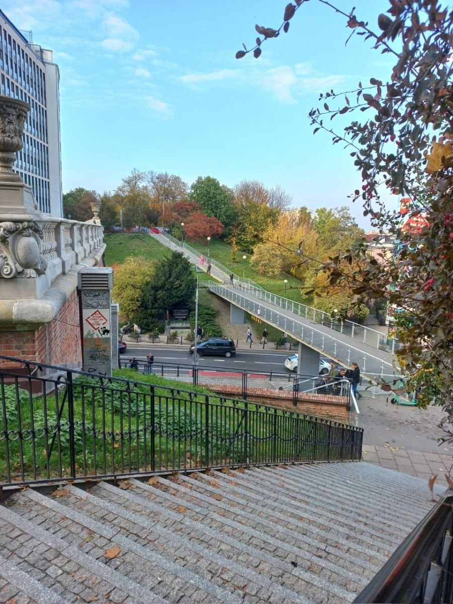 Tamka z widokiem na Zieloną Skarpę Wiślaną i ulicę Dynasy z piękną panoramą Pałacu Ostrogskich, siedzibą Narodowego Instytutu i Muzeum Fryderyka Chopina.