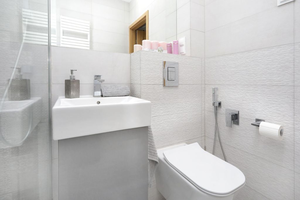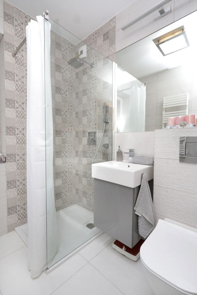 - Łazienka w nowoczesnym stylu, wyposażona w wygodny prysznic.