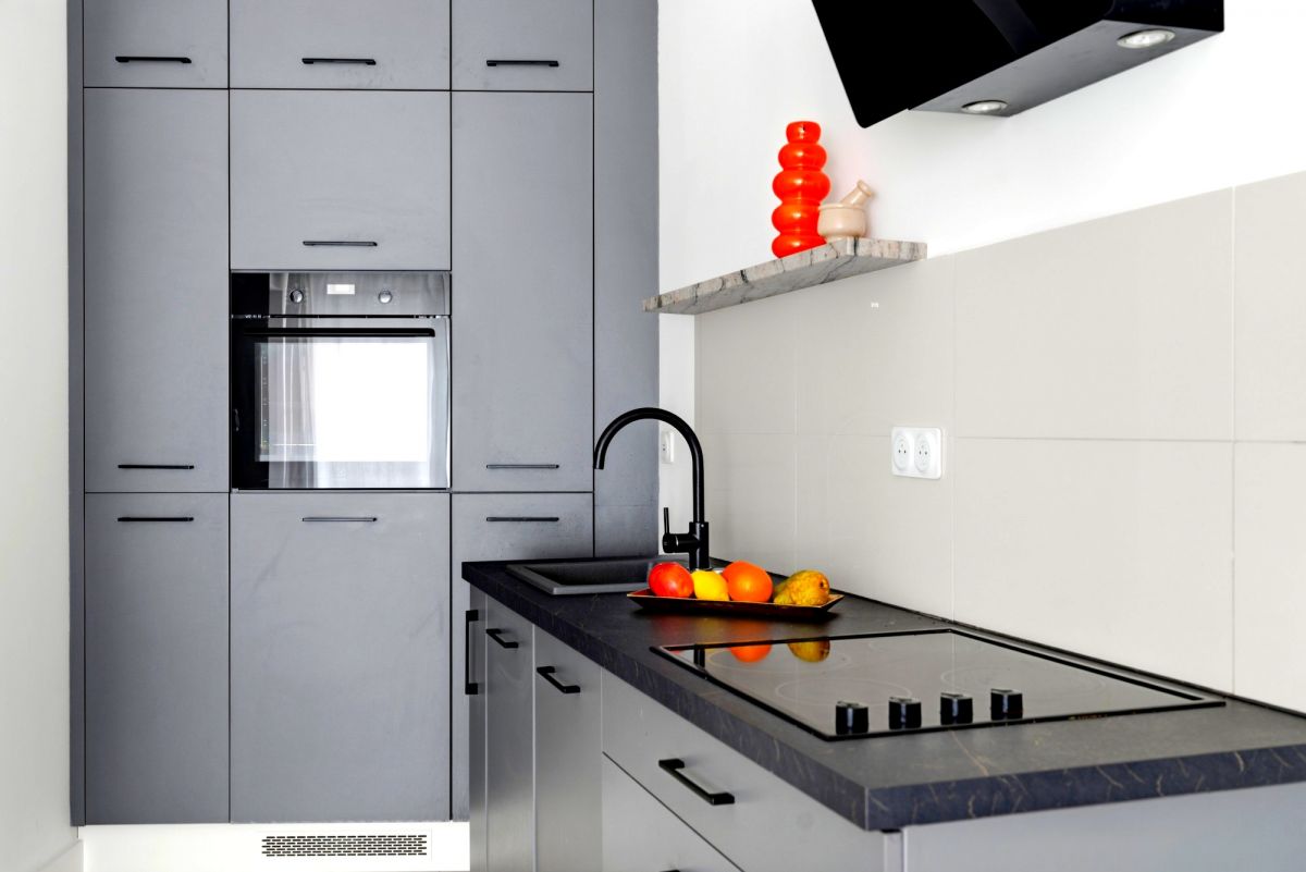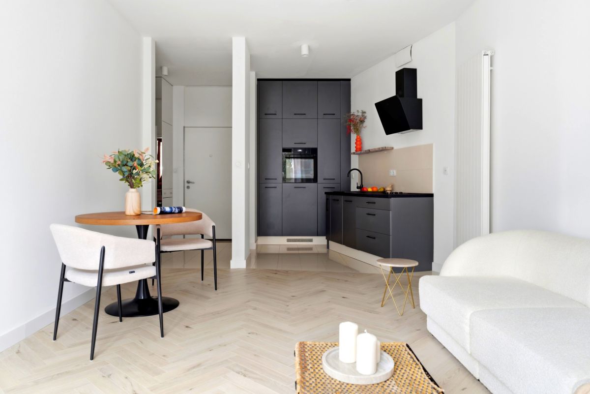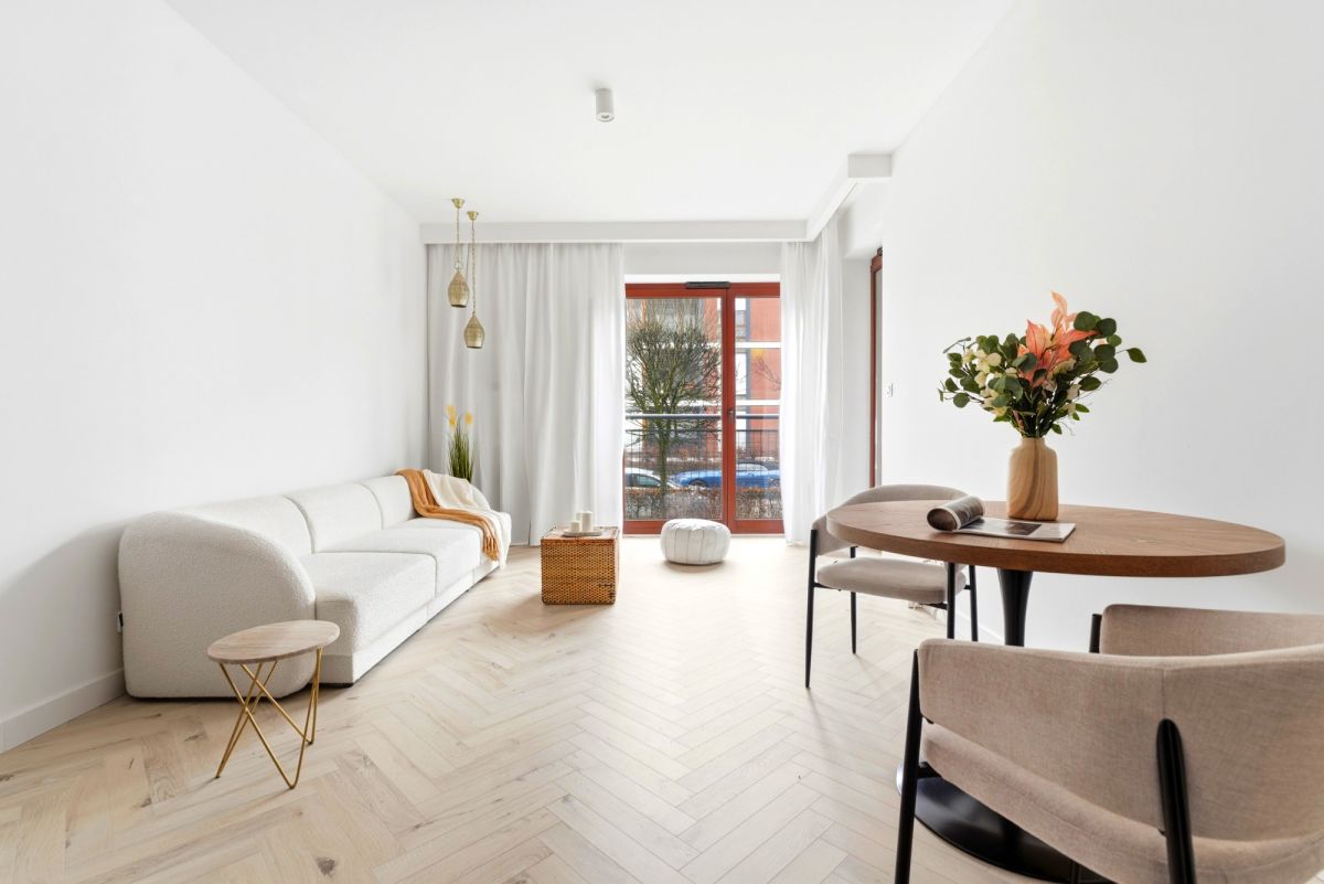 * Przestronna i funkcjonalna strefa dzienna z nowoczesnym salonem, wyjściem na balkon oraz w pełni wyposażonym aneksem kuchennym,