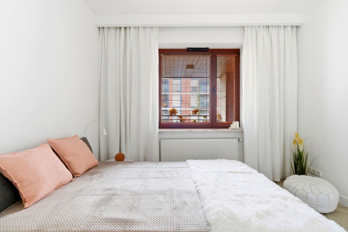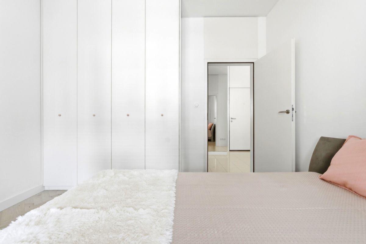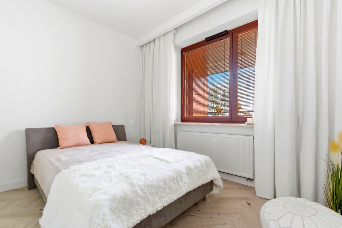 * Elegancka sypialnia wykończona z dbałością o detale, z dużym, wygodnym łóżkiem oraz pojemną szafą,