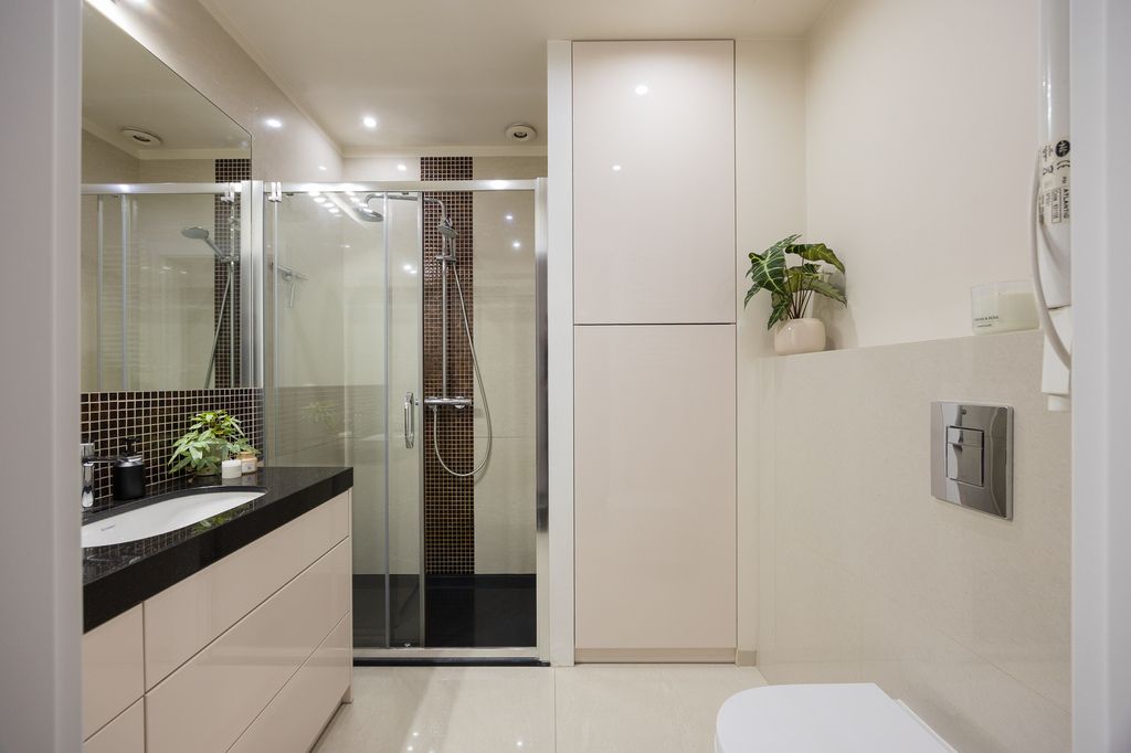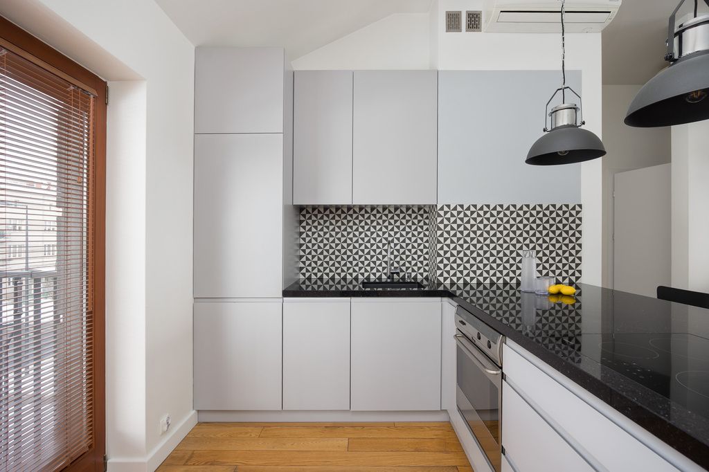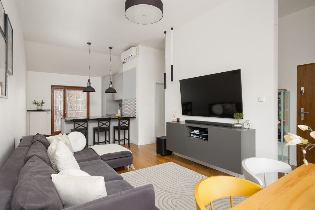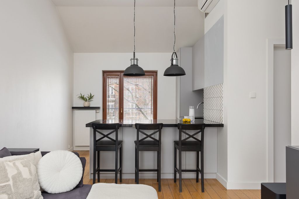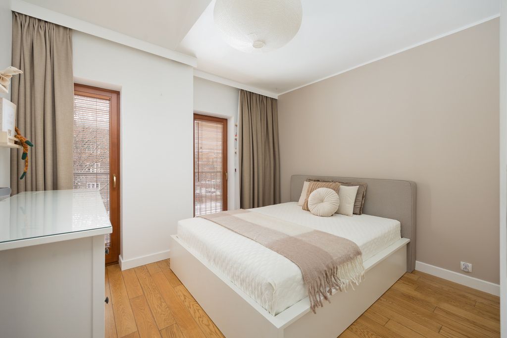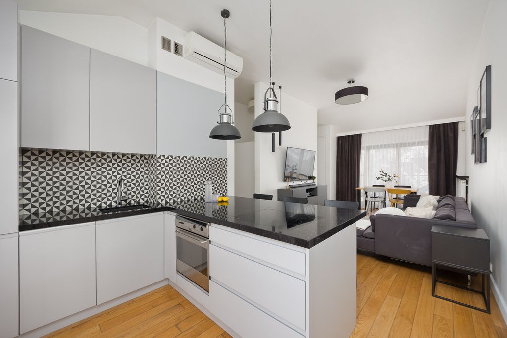 W salonie, kuchni oraz sypialni na podłodze znajduje się drewniana podłoga. Kuchnia została wyposażona w zabudowę na wymiar z wyspą oraz granitowymi blatami i parapetami. W łazience wykonano zabudowę stolarską na zamówienie z granitowym blatem, przewidziano miejsce na pralkę oraz suszarkę, a dodatkowym atutem jest ogrzewanie podłogowe. Mieszkanie wyposażone jest również w klimatyzację.