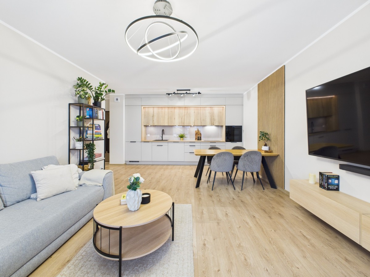 - Duży pokój z otwartą kuchnią i wyjściem na taras;