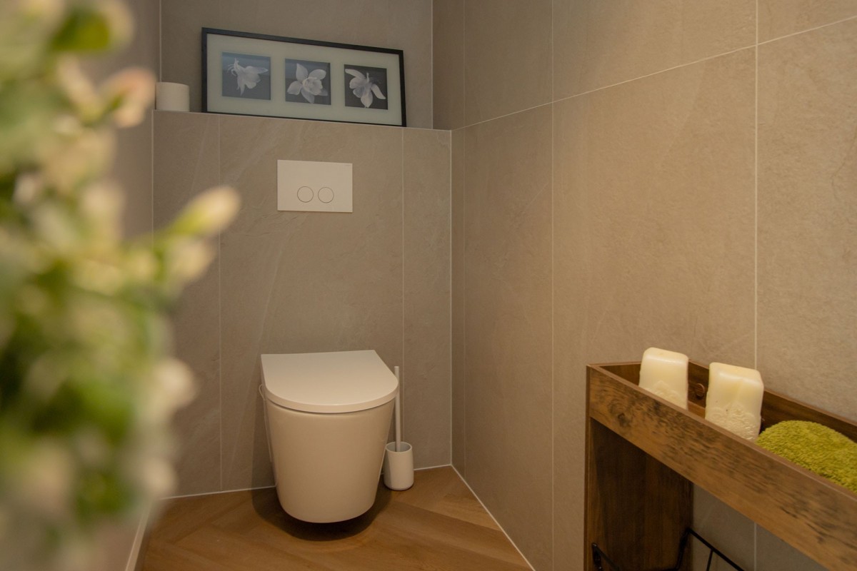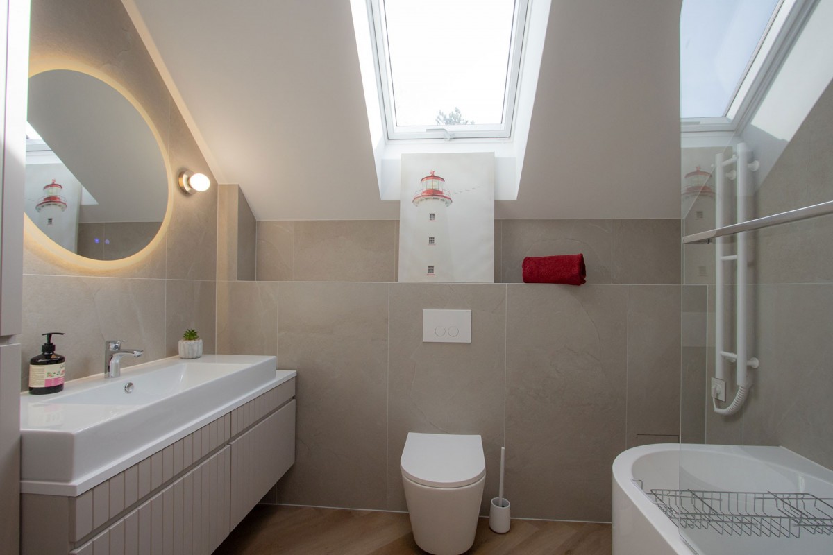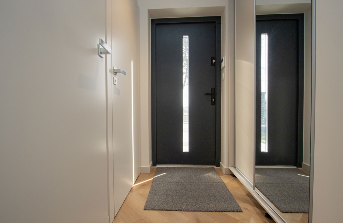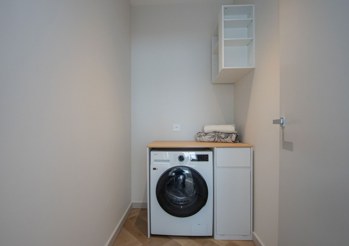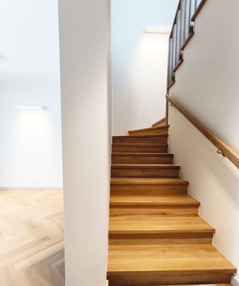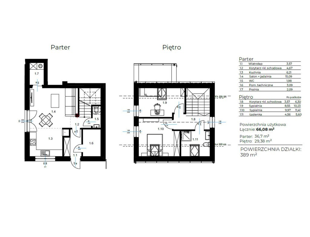 Na dole znajduje się wiatrołap z dużą szafą, salon z aneksem kuchennym i wyjściem na ogród, pom. gospodarcze, pralnia, łazienka i schowek.