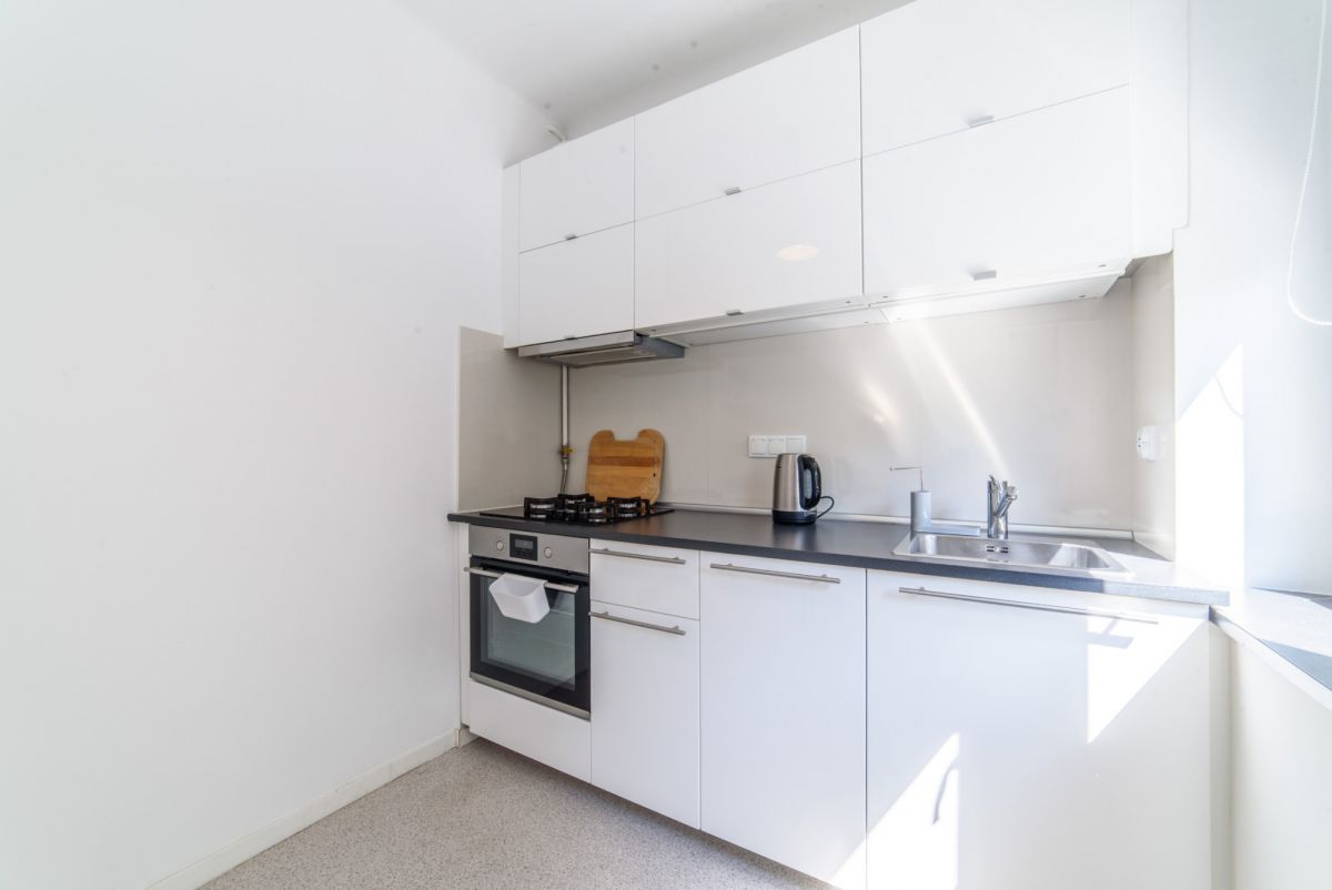 Oddzielna zamykana kuchnia z oknem, wyposażona w sprzęt AGD (nowoczesny piekarnik, płytę gazową, lodówkę i zmywarkę), szafki kuchenne, zlewozmywak, talerze, szklanki i sztućce.