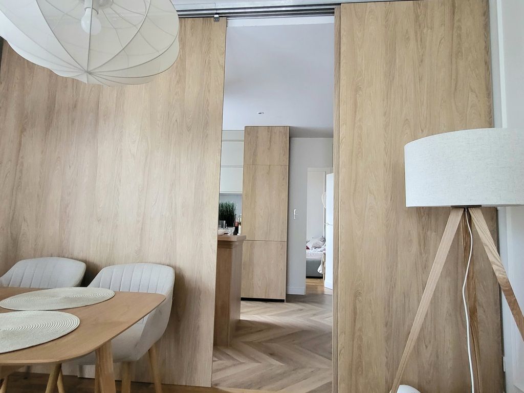 Niestandardowym rozwiązaniem jest przesuwna ściana z płyt drewnianych oddzielająca salon od kuchni.