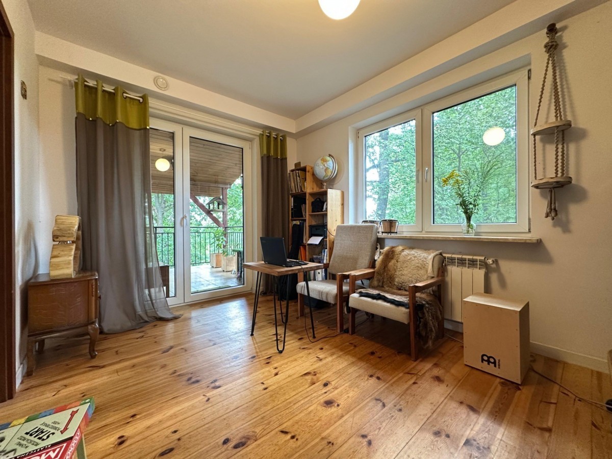 Dom znajduje się na końcu "ślepej" uliczki i jest usytuowany na skarpie-wydmie. Do Kampinoskiego Parku Narodowego jest około 7 minut pieszo. Do stacji metra Młociny - około 10 minut samochodem. Szkoła i sklep spożywczy w zasięgu krótkiego spaceru.