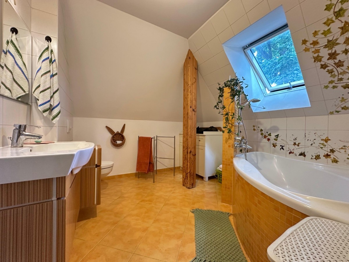 Piwnica (wysokość sufitu: 2,5 m): Garaż z warsztatem, pralnia z WC i prysznicem, kotłownia, spiżarnia oraz pomieszczenie rekreacyjno-gospodarcze, które można zaadoptować na pokój lub pracownię (doświetlone światłem naturalnym).