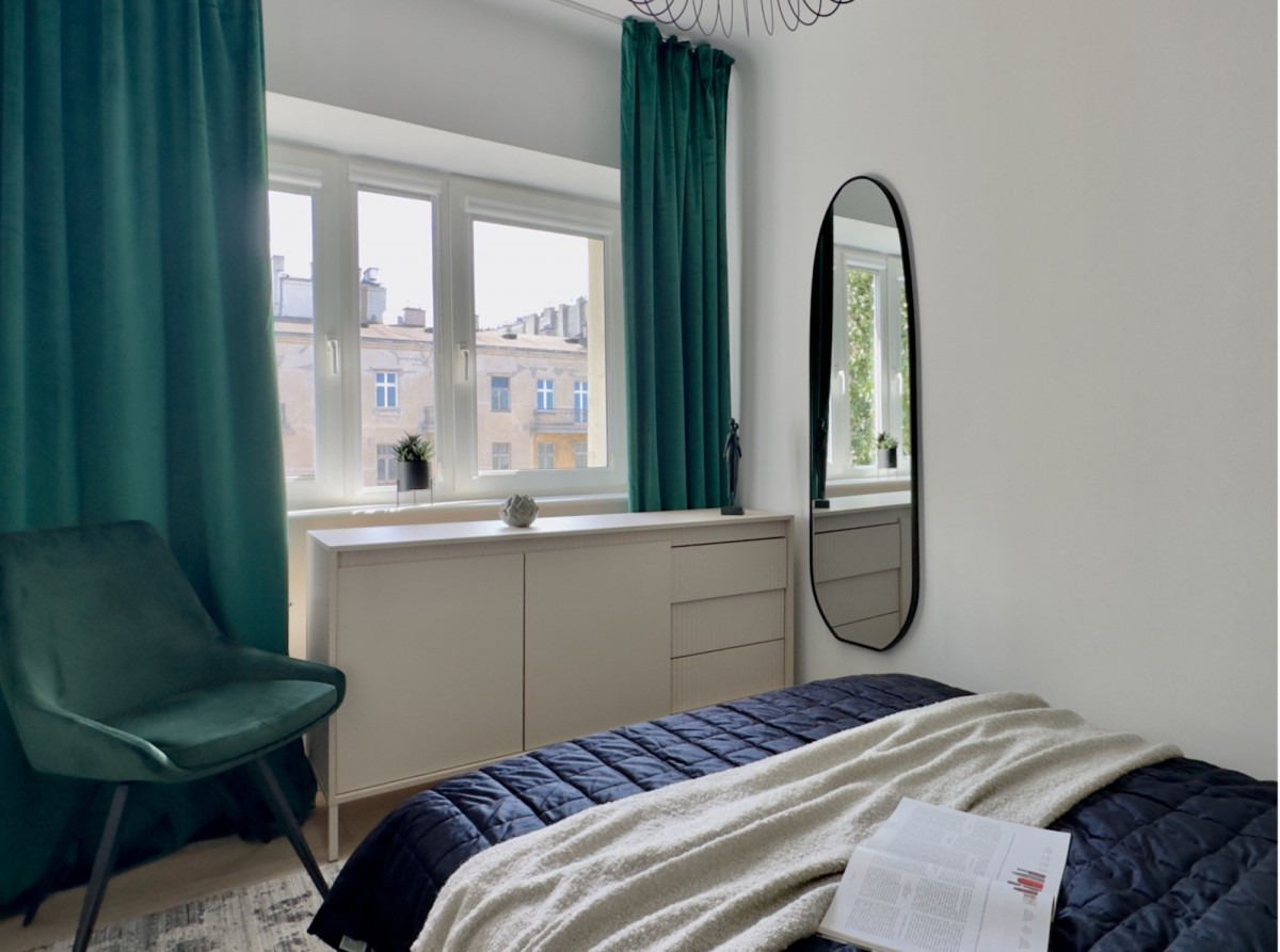- salonu z widokiem na Plac Bankowy (sofa z funkcją spania, biurko z krzesłem, komoda, regał z zamykaną szafką),