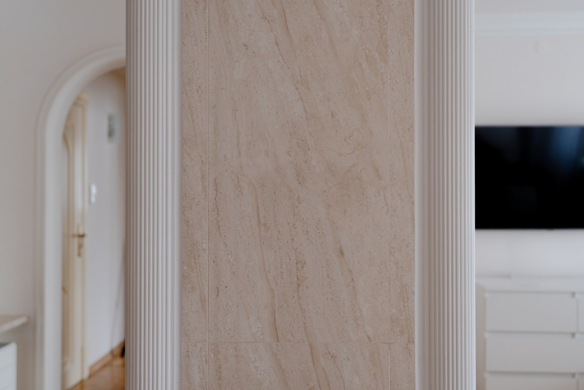 Elementy konstrukcyjne - w tym filary - zostały wykończone naturalnym marmurem Crema Marfil, co podkreśla elegancki charakter wnętrza i spójność aranżacyjną.