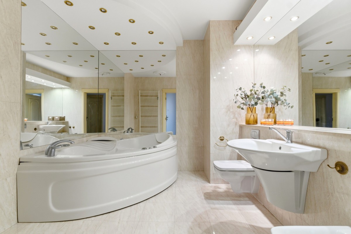 - łazienkę główną wykończoną naturalnym marmurem Crema Marfil,
