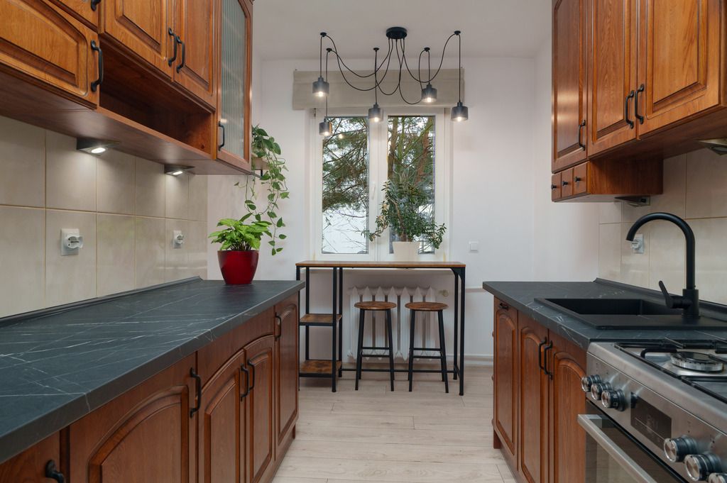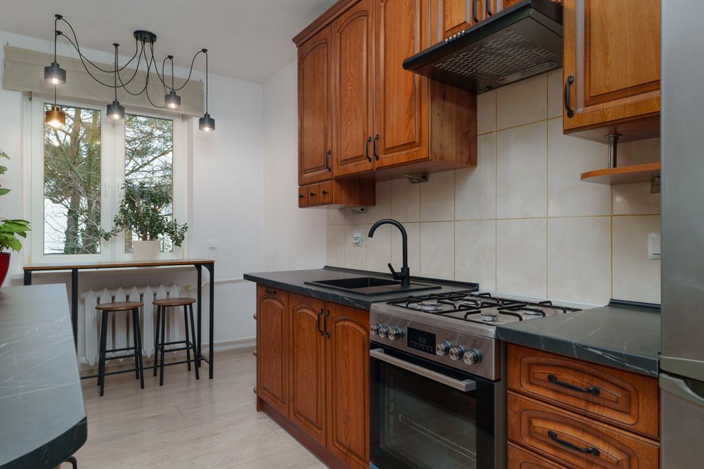 Kuchnia (9,9 m²) jest zamknięta i jasna. Jest tu duże okno, nowy barowy stolik z drewnianymi taboretami, więc można spokojnie usiąść z kawą, lub zjeść szybki posiłek. Właściciele odświeżyli to pomieszczenie — są nowe blaty, czarny zlew z baterią, okap i kuchenka. Całość jest prosta i przyjemna w użytkowaniu.