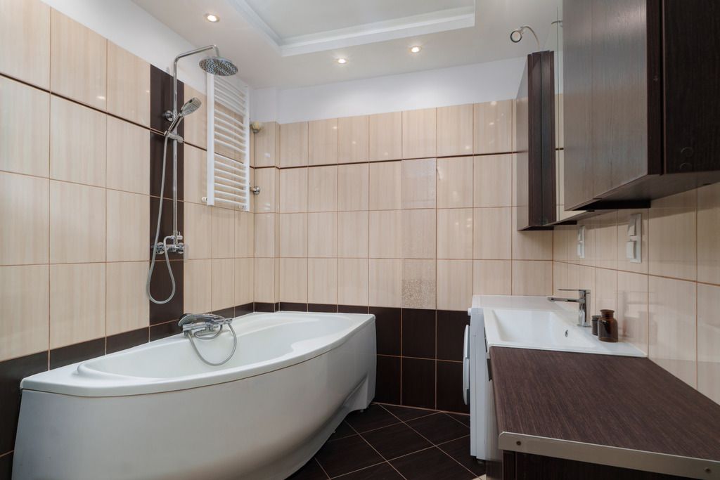 The bathroom (5.6 m²) is functional — equipped with a large bathtub with a rain shower, a washing machine, and spacious cabinets. Thanks to the built-in storage with a countertop, the bathroom is not only aesthetic but also very practical, offering convenient organisation and everyday comfort.