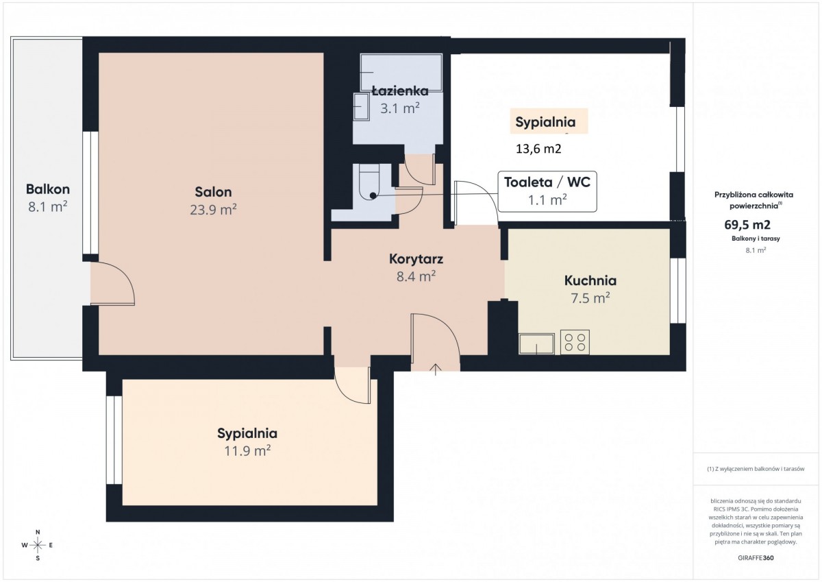To mieszkanie o powierzchni 69,5 m² zapewnia maksymalną użyteczność, ponieważ każdy metr kwadratowy został tu optymalnie zagospodarowany.