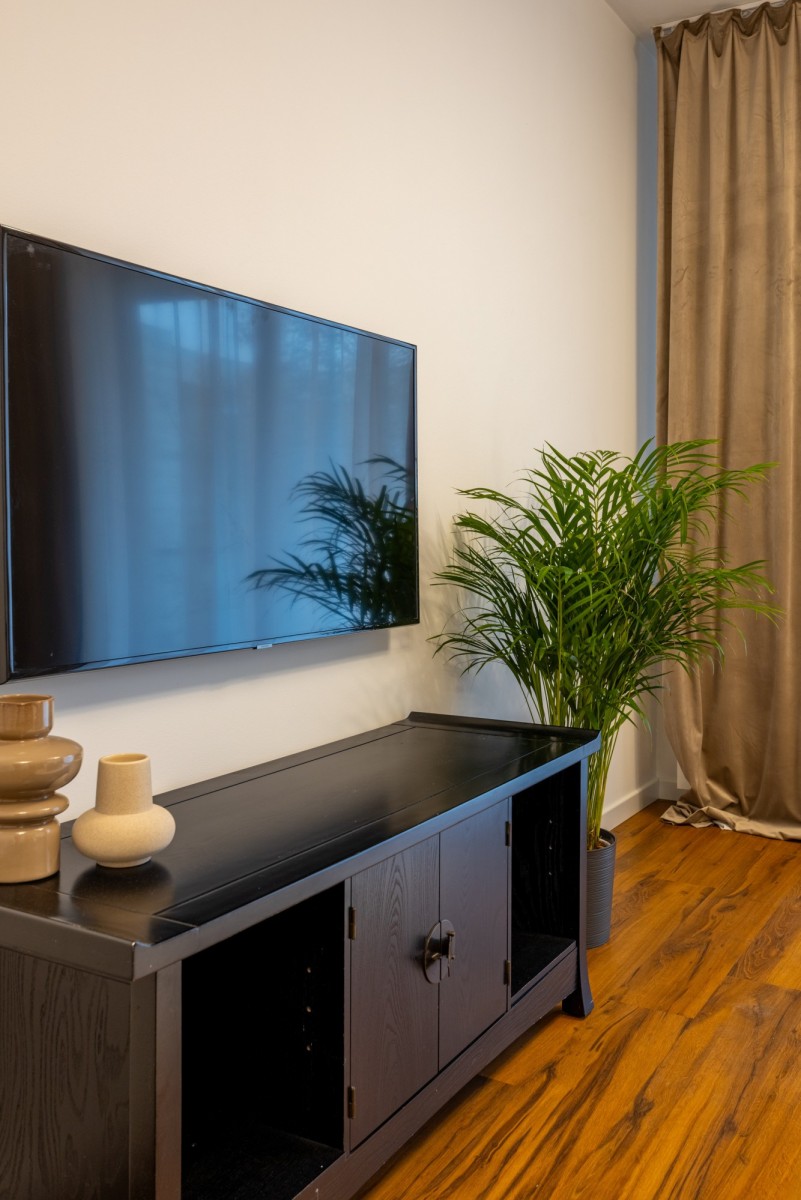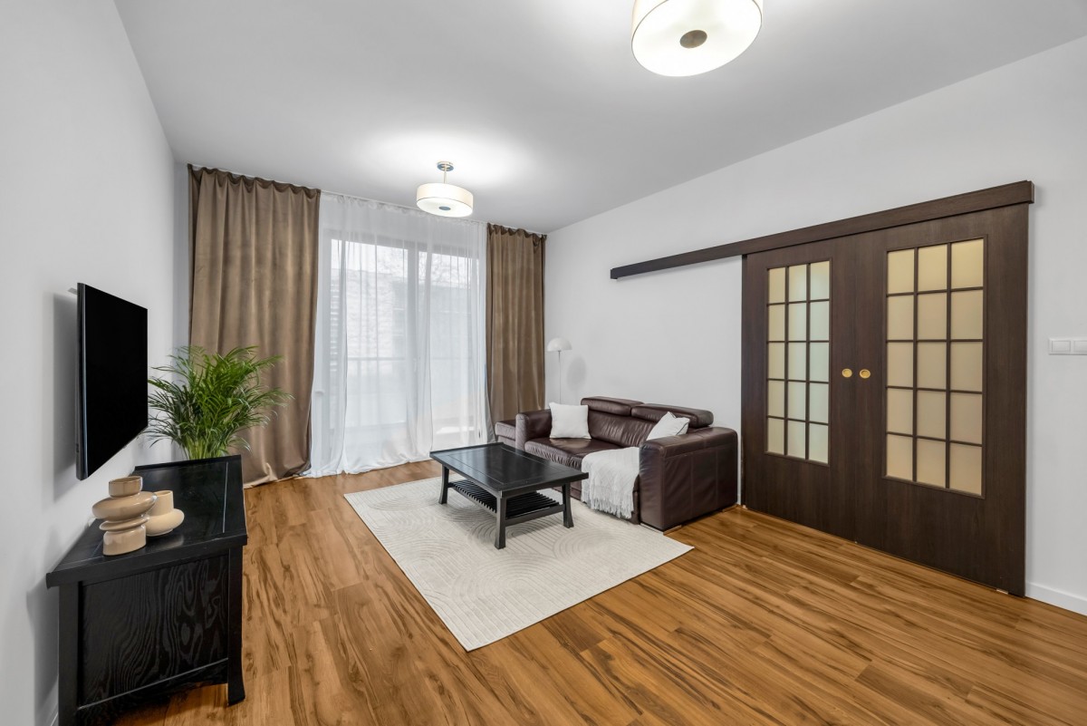 - Przestronny salon z wyjściem na dużą loggię, idealną do wypoczynku