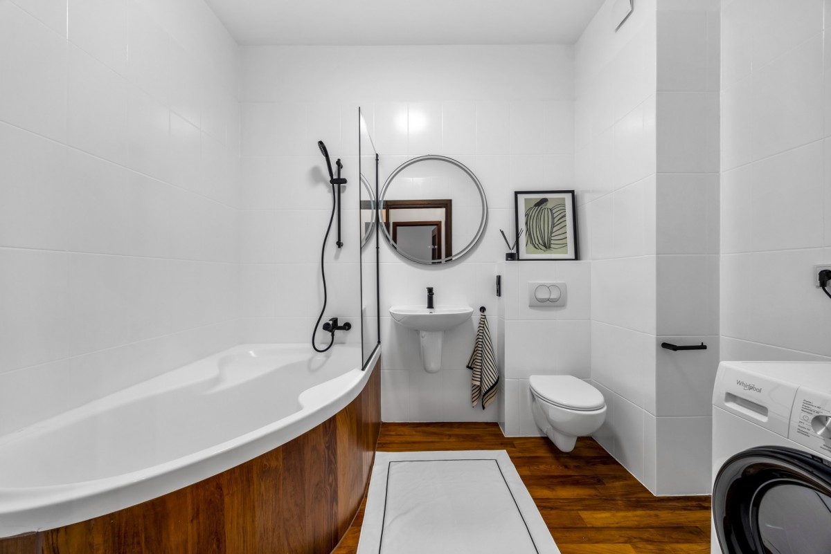 Osobna kuchnia zapewnia komfort codziennego użytkowania, a dodatkowa toaleta gościnna podnosi funkcjonalność mieszkania.