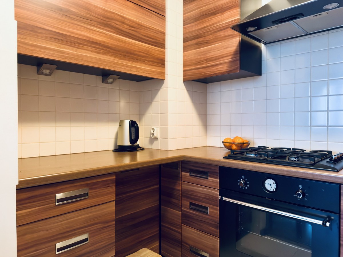 Kuchnia umeblowana i wyposażona w sprzęty AGD (lodówko-zamrażalkę, kuchnię gazową z piekarnikiem, okap) oraz rozkładanym stołem z krzesłami.