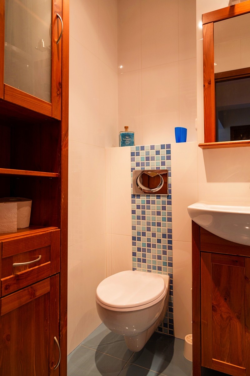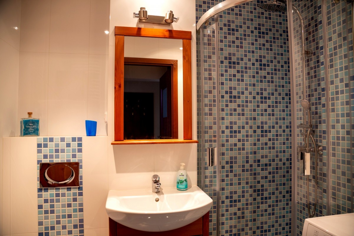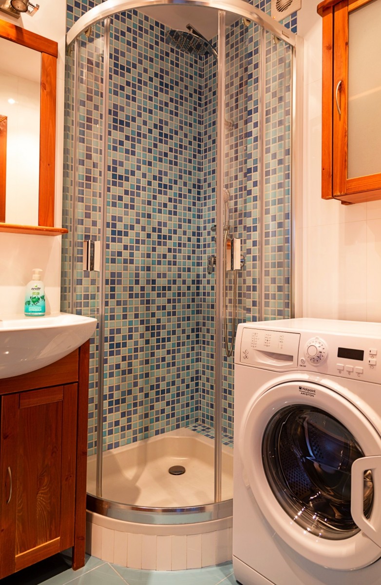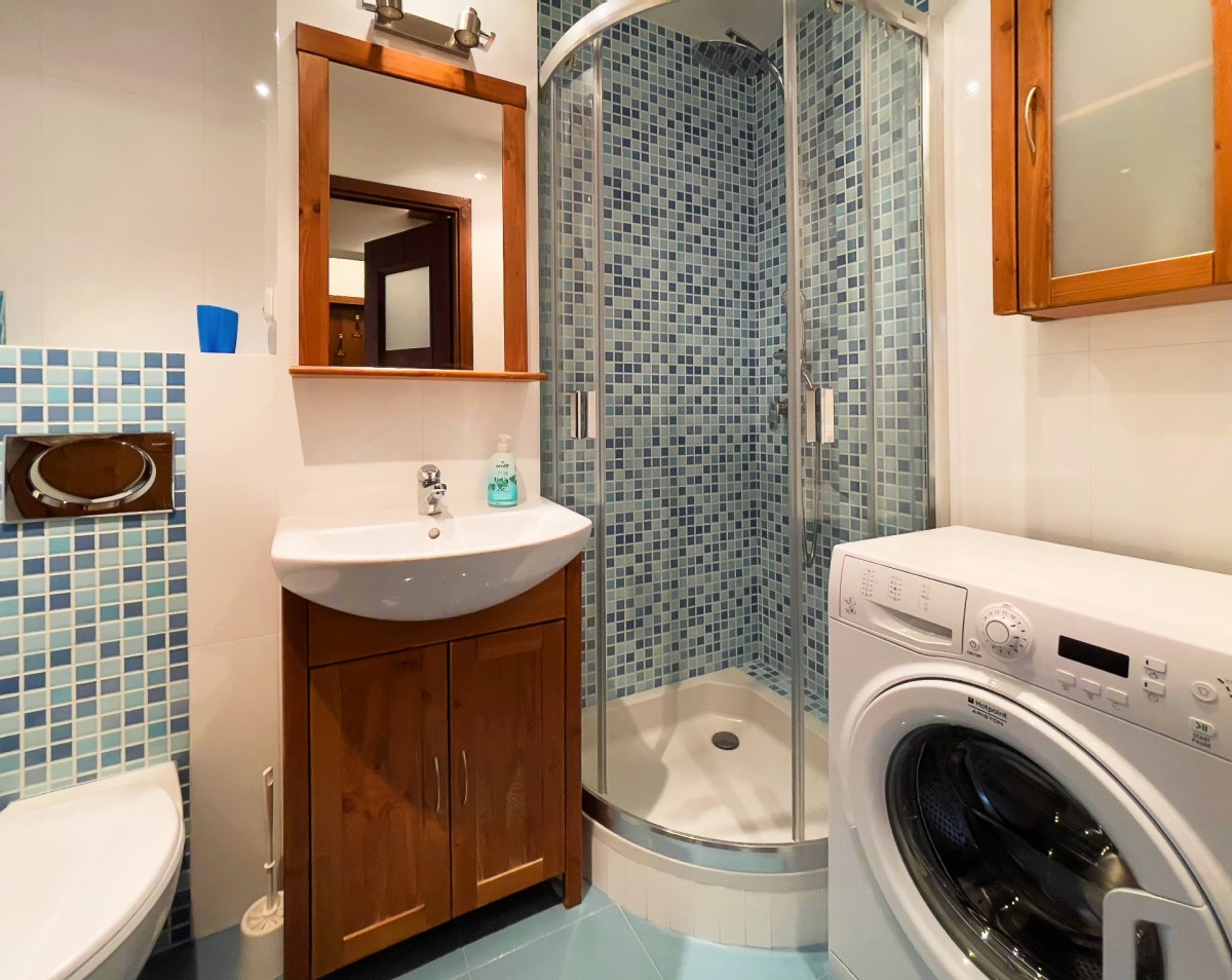 W łazience znajduje się umywalka, prysznic, WC, pralka oraz szafki łazienkowe.