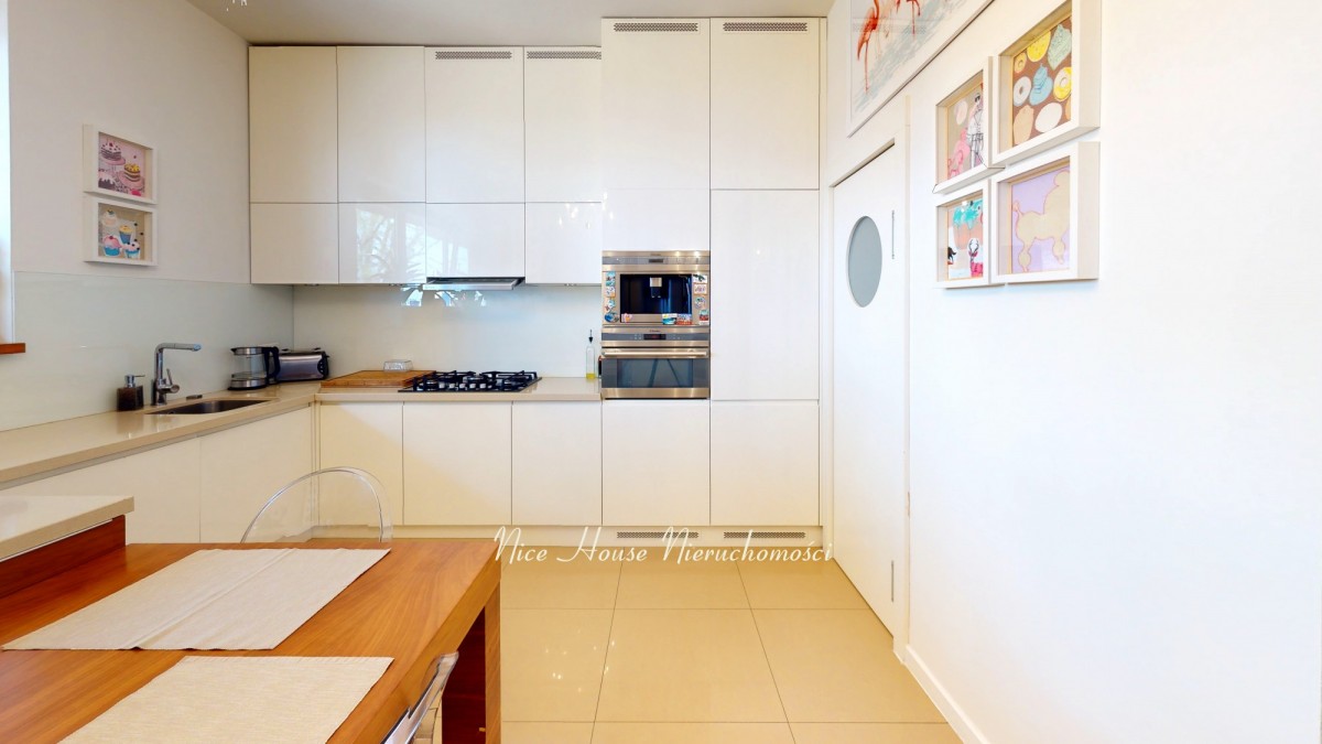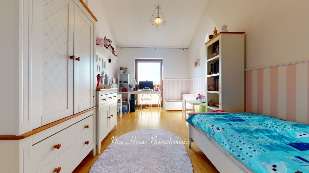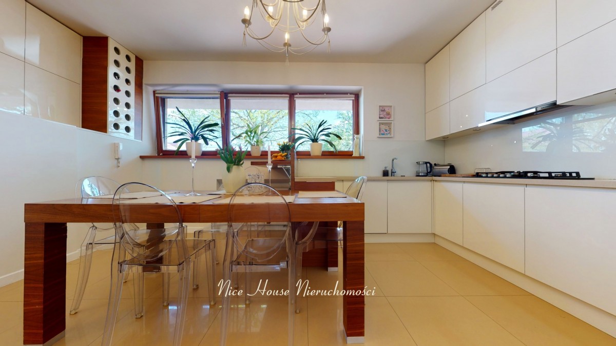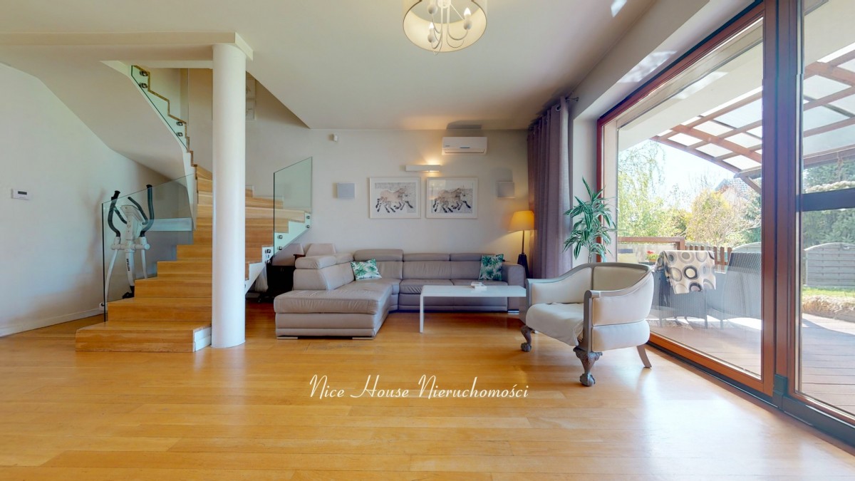 Cały dom wykończony jest w wysoki standardzie. Salon zakończony jest przeszkloną ścianą w postaci drewnianych przesuwanych okien balkonowych wychodzących na taras. Kuchnia w zabudowie wraz ze spiżarnią. Na pierwszym piętrze znajdują się trzy sypialnie oraz dwie łazienki, natomiast drugie piętro przeznaczone zostało na gabinet.