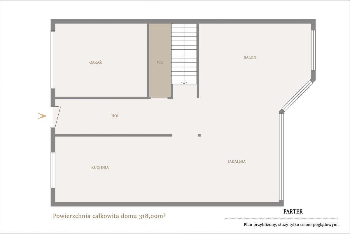 Na parterze znajduje się salon z wyjściem na ogród z tarasem, jadalnia i otwarta, jasna kuchnia z oknem, przestronnym holem i toaletą.