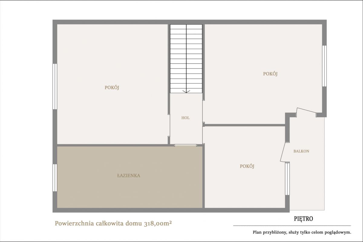Na piętrze znajdują się sypialnia główna z przynależną do niej łazienką, dwie dodatkowe sypialnie i łazienka.