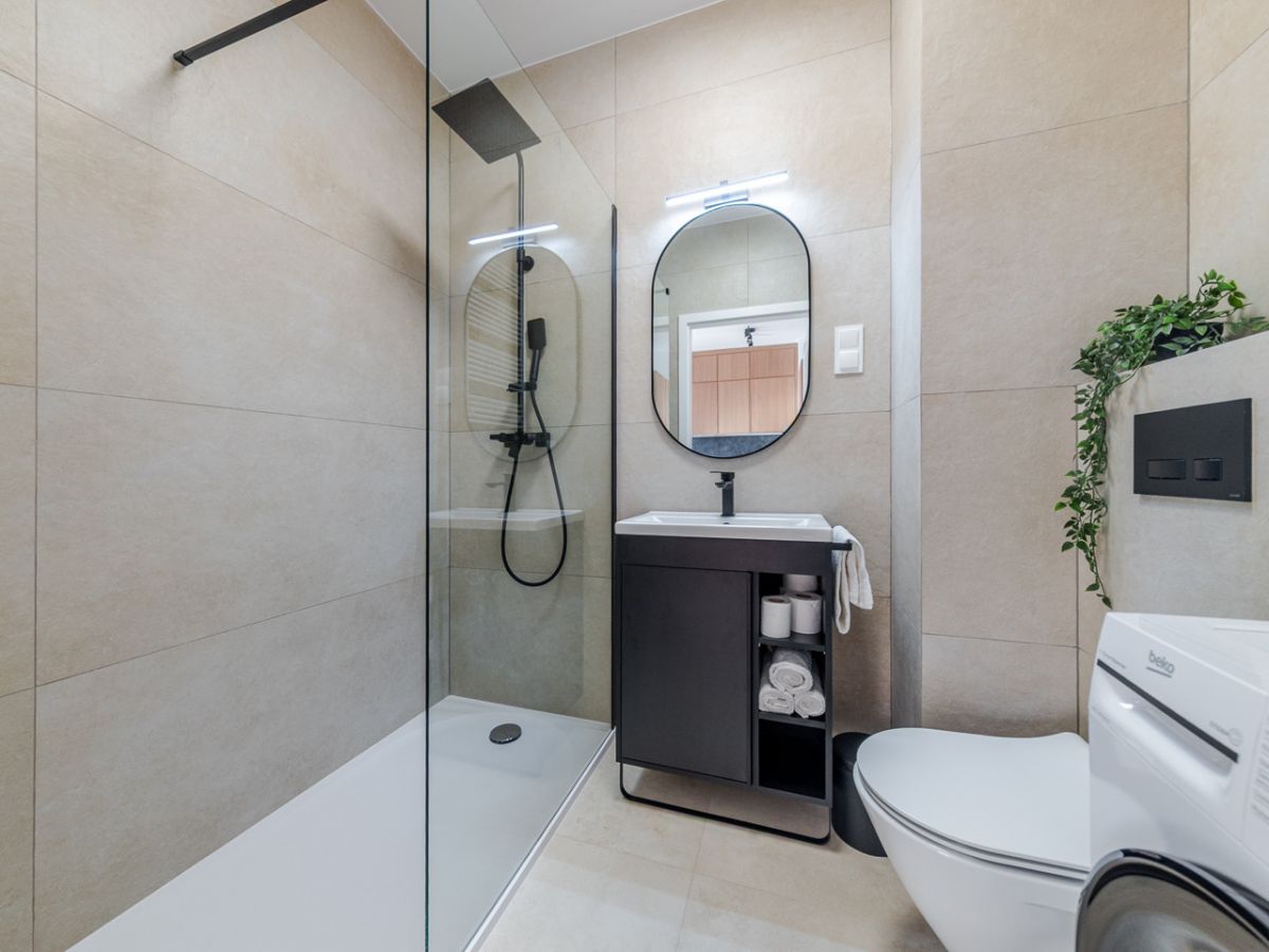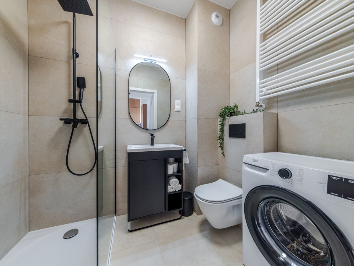 Łazienka(3,50 m²) - elegancka łazienka wykończona beżowym gresem, z nowoczesną armaturą, pralką Beko oraz dużym prysznicem typu walk-in.