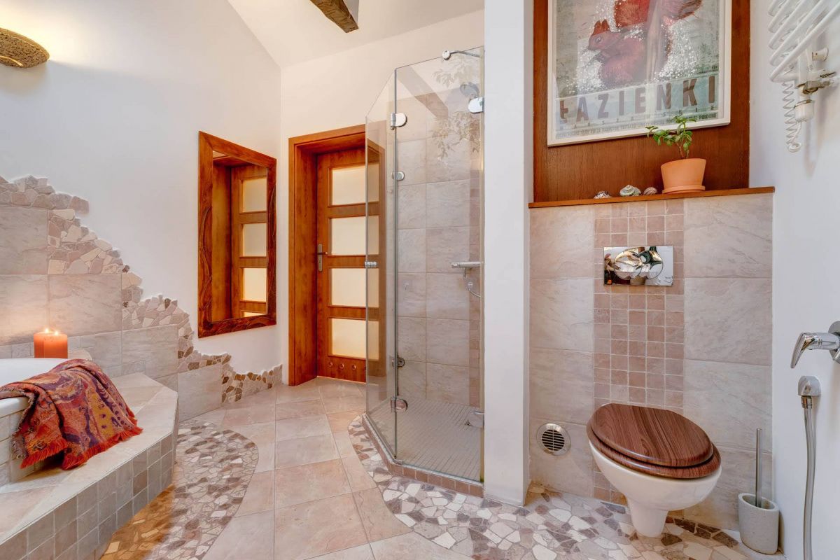 - wyjątkowa łazienka typu domowe SPA z wysokimi sufitami, roślinnością, dużą wanną i oknem dachowym,