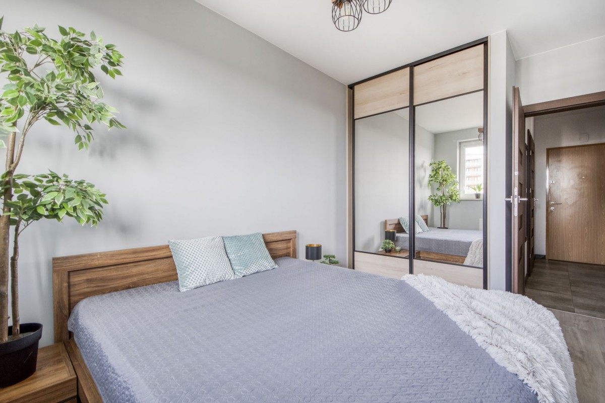 Przede wszystkim funkcjonalnie urządzona przestrzeń. Wejście do mieszkania do przedpokoju z praktyczną szafą w zabudowie. Po prawej łazienka z WC urządzona, po lewej salon z rozkładaną kanapą, stolikiem, stołem z krzesłami oraz telewizorem, na wprost wejścia sypialnia z łóżkiem i szafą w zabudowie.